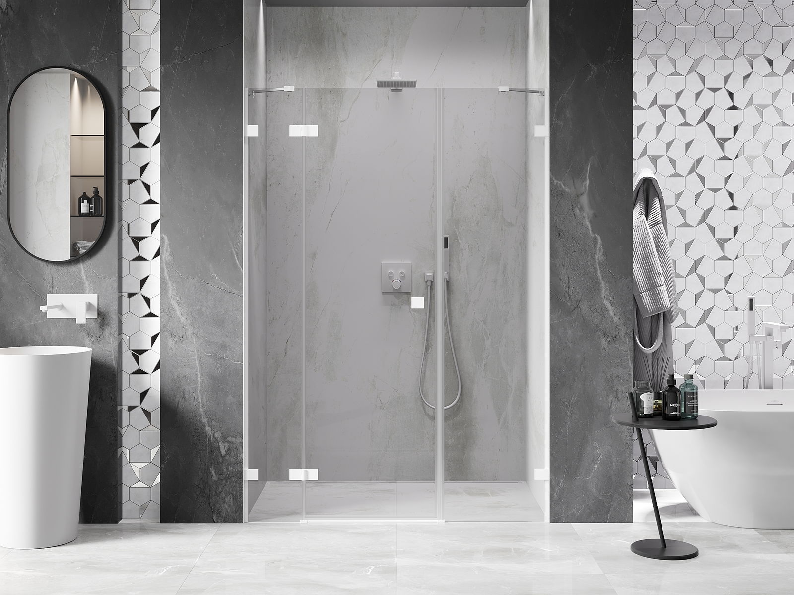 A pega prática e confortável foi feita de metal durável e resistente. A forma moderna combinada com o acabamento ajustado à cor dos perfis confere a todo o conjunto uma aparência moderna e estilosa, realçando a estética de qualquer casa de banho.