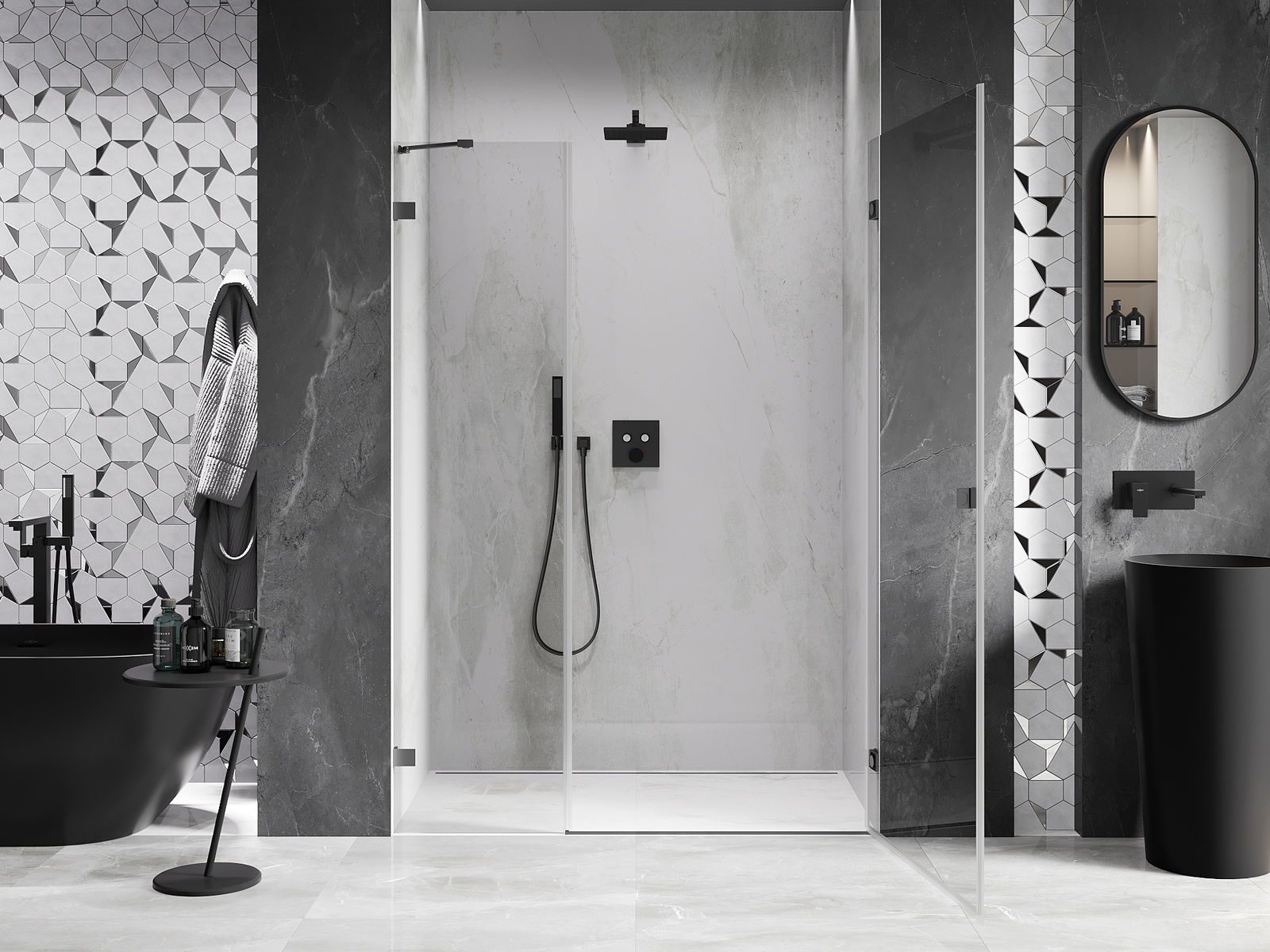 A pega prática e confortável foi feita de metal durável e resistente. A forma moderna combinada com o acabamento ajustado à cor dos perfis confere a todo o conjunto uma aparência moderna e estilosa, realçando a estética de qualquer casa de banho.