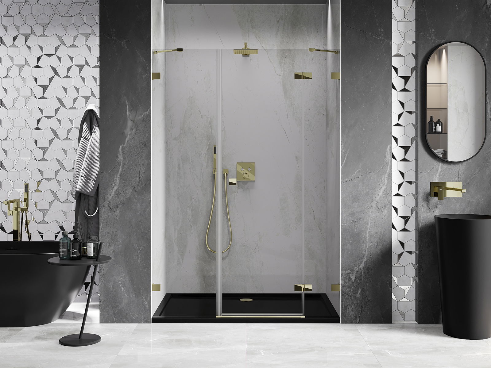 A pega prática e confortável foi feita de metal durável e resistente. A forma moderna combinada com o acabamento ajustado à cor dos perfis confere a todo o conjunto uma aparência moderna e estilosa, realçando a estética de qualquer casa de banho.