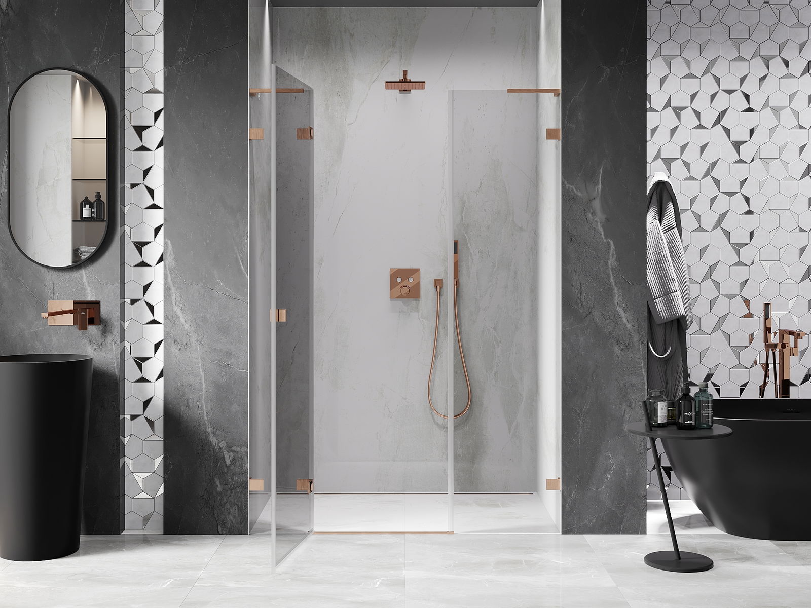 A pega prática e confortável foi feita de metal durável e resistente. A forma moderna combinada com o acabamento ajustado à cor dos perfis confere a todo o conjunto uma aparência moderna e estilosa, realçando a estética de qualquer casa de banho.