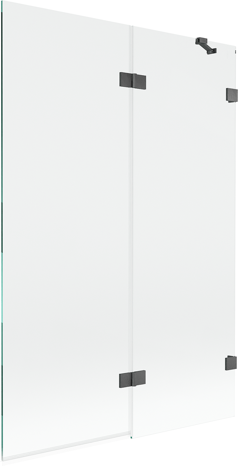 Écrã feito de duas portas com possibilidade de dobrar. Esta solução permite economizar mais espaço na casa de banho e permite o uso livre do espaço restante quando não estamos a usar a área de banho.