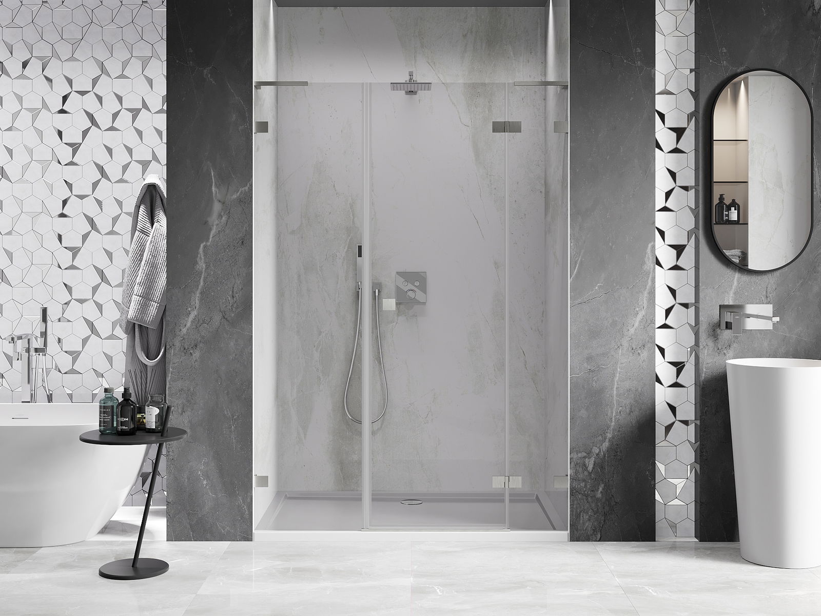 A pega prática e confortável foi feita de metal durável e resistente. A forma moderna combinada com o acabamento ajustado à cor dos perfis confere a todo o conjunto uma aparência moderna e estilosa, realçando a estética de qualquer casa de banho.