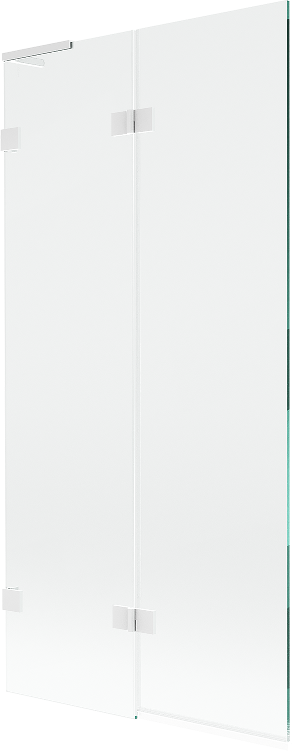 Écrã feito de duas portas com possibilidade de dobrar. Esta solução permite economizar mais espaço na casa de banho e permite o uso livre do espaço restante quando não estamos a usar a área de banho.