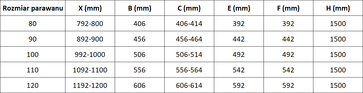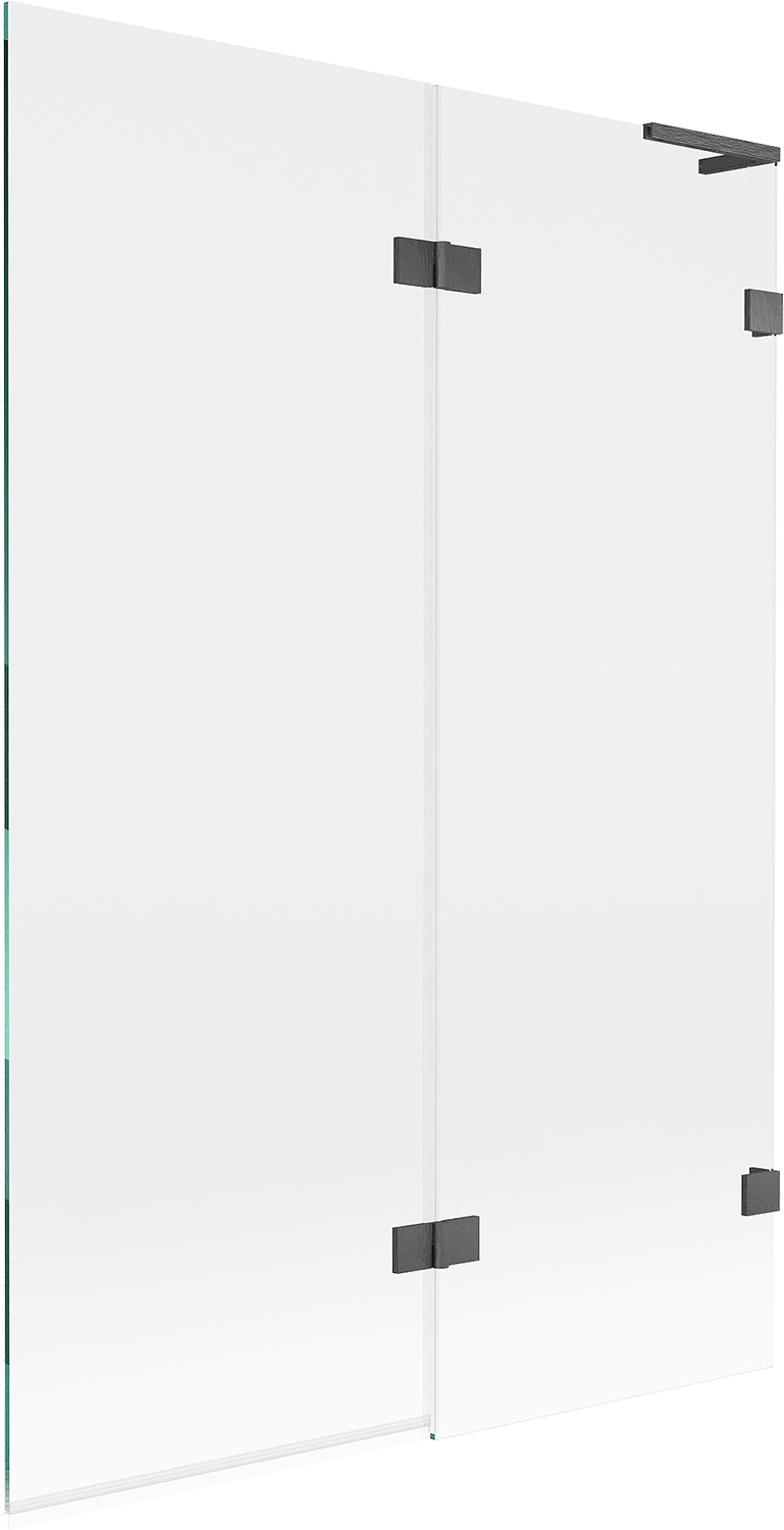 Écrã feito de duas portas com possibilidade de dobrar. Esta solução permite economizar mais espaço na casa de banho e permite o uso livre do espaço restante quando não estamos a usar a área de banho.