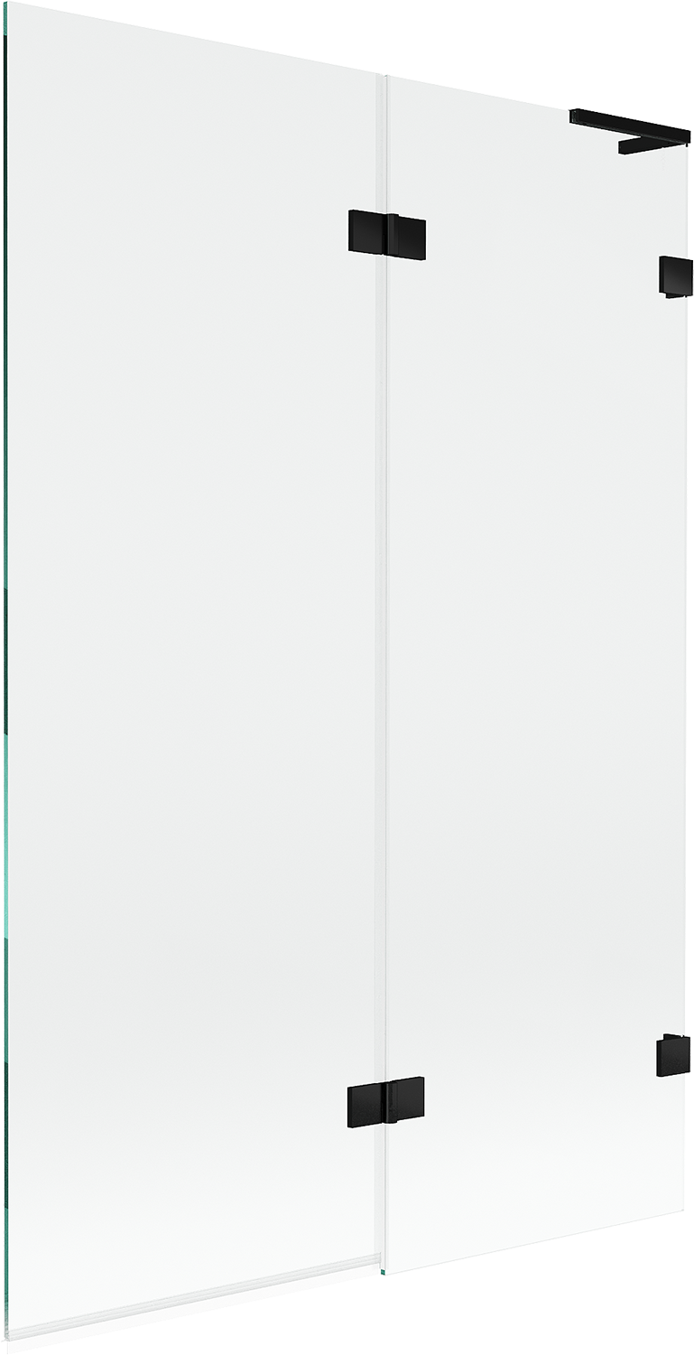 Écrã feito de duas portas com possibilidade de dobrar. Esta solução permite economizar mais espaço na casa de banho e permite o uso livre do espaço restante quando não estamos a usar a área de banho.