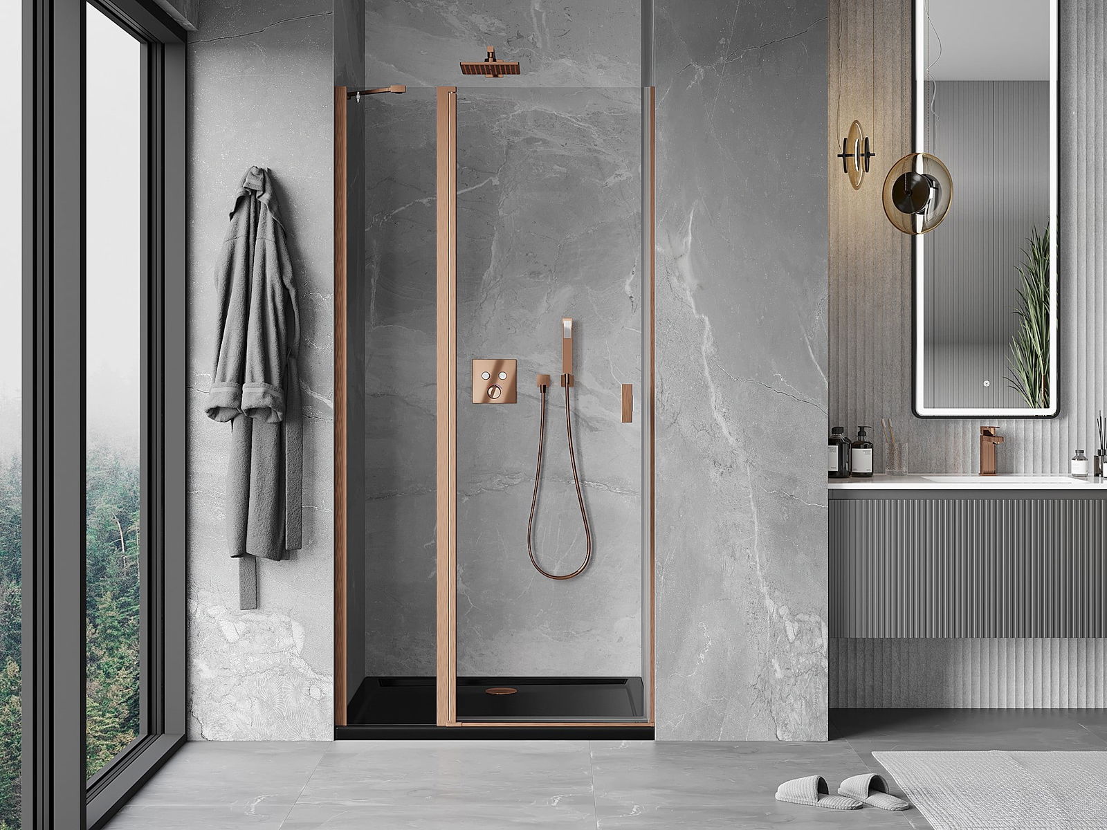 A pega prática e confortável foi feita de metal durável e resistente. A forma moderna combinada com o acabamento ajustado à cor dos perfis confere a todo o conjunto uma aparência moderna e estilosa, realçando a estética de qualquer casa de banho.