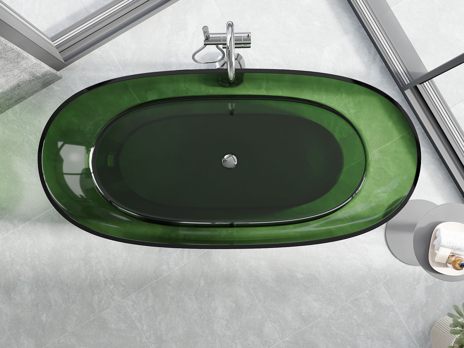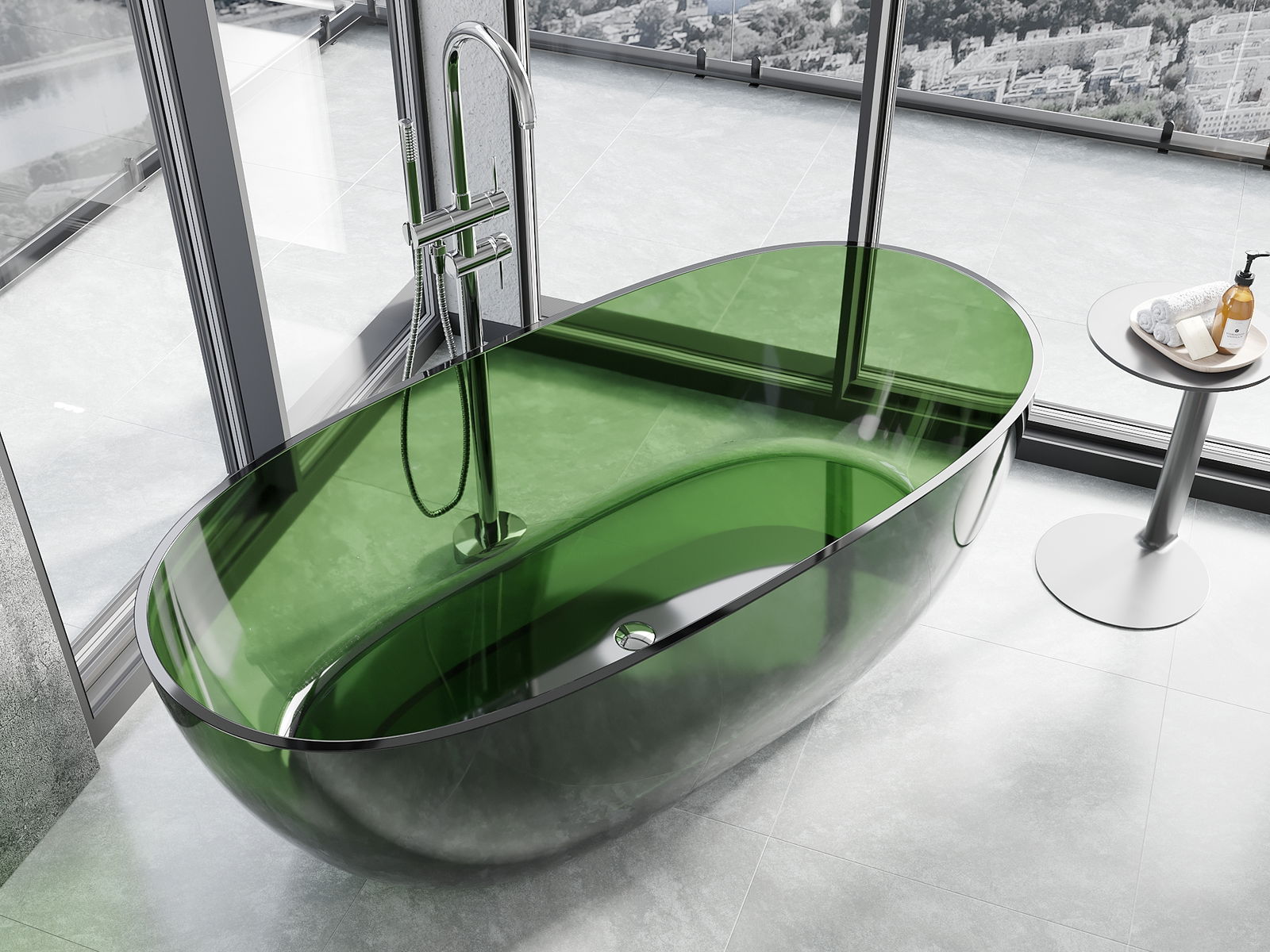 É um material moderno que combina uma aparência elegante com alta durabilidade. É resistente a danos mecânicos, fácil de limpar e agradável ao toque. A forma transparente e a borda fina da banheira conferem-lhe leveza e um caráter único, criando um destaque impressionante na decoração da casa de banho.
