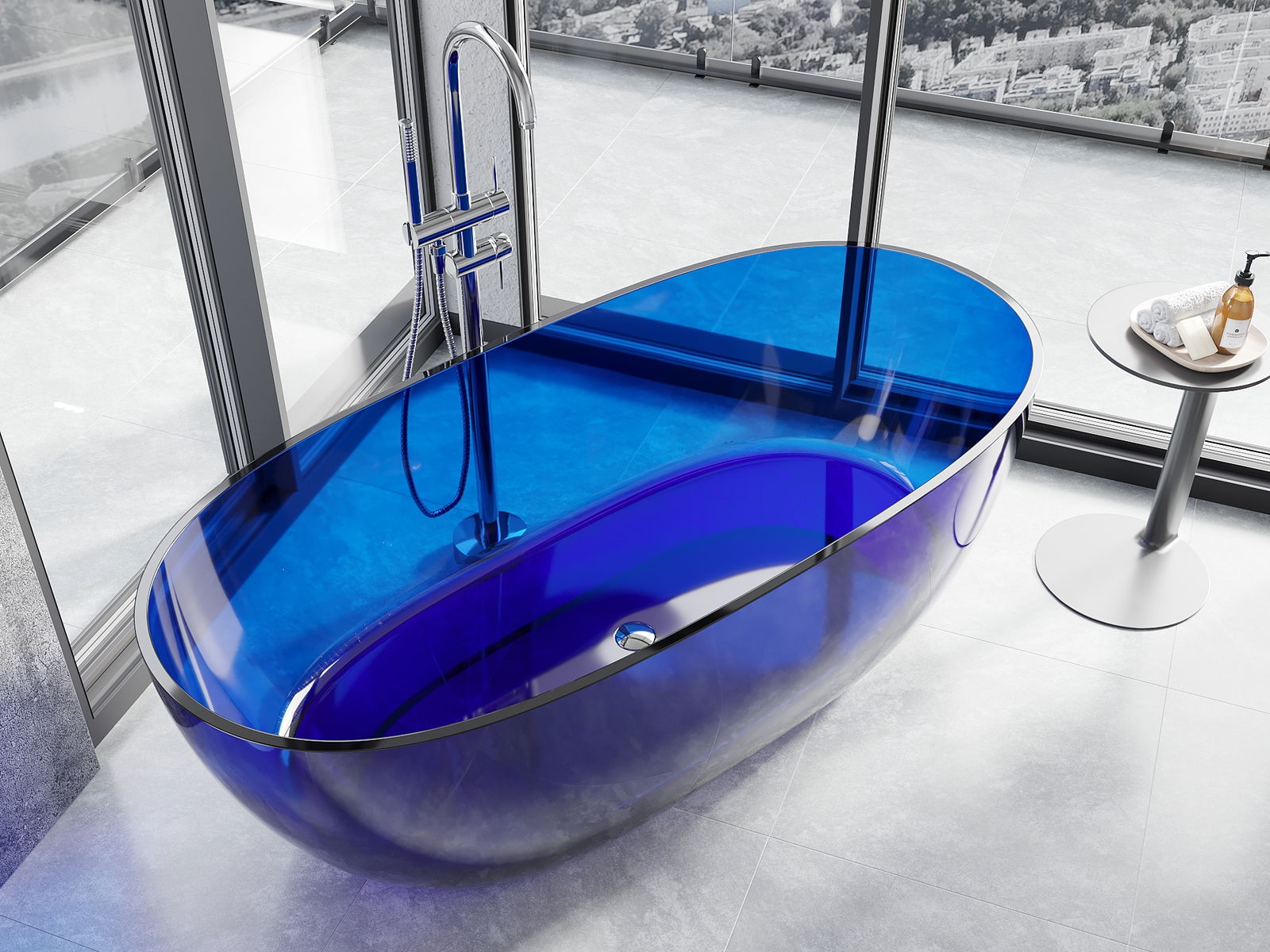 É um material moderno que combina uma aparência elegante com alta durabilidade. É resistente a danos mecânicos, fácil de limpar e agradável ao toque. A forma transparente e a borda fina da banheira conferem-lhe leveza e um caráter único, criando um destaque impressionante na decoração da casa de banho.