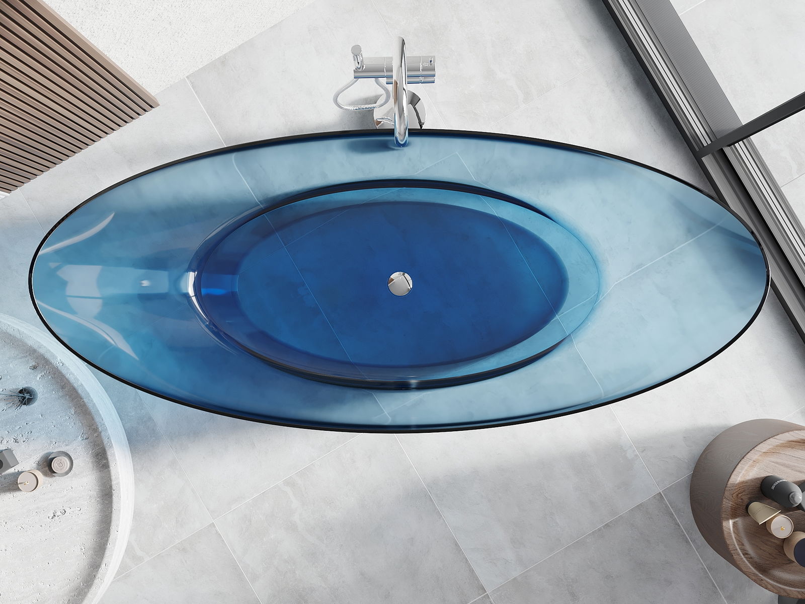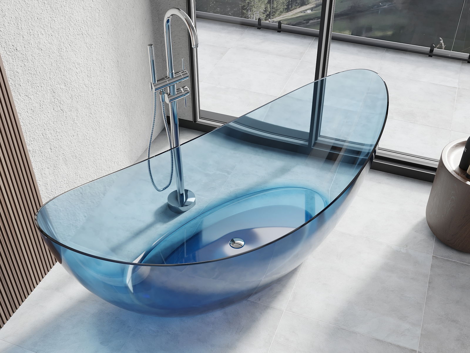 É um material moderno que combina uma aparência elegante com alta durabilidade. É resistente a danos mecânicos, fácil de limpar e agradável ao toque. A forma transparente e a borda fina da banheira conferem-lhe leveza e um caráter único, criando um destaque impressionante na decoração da casa de banho.