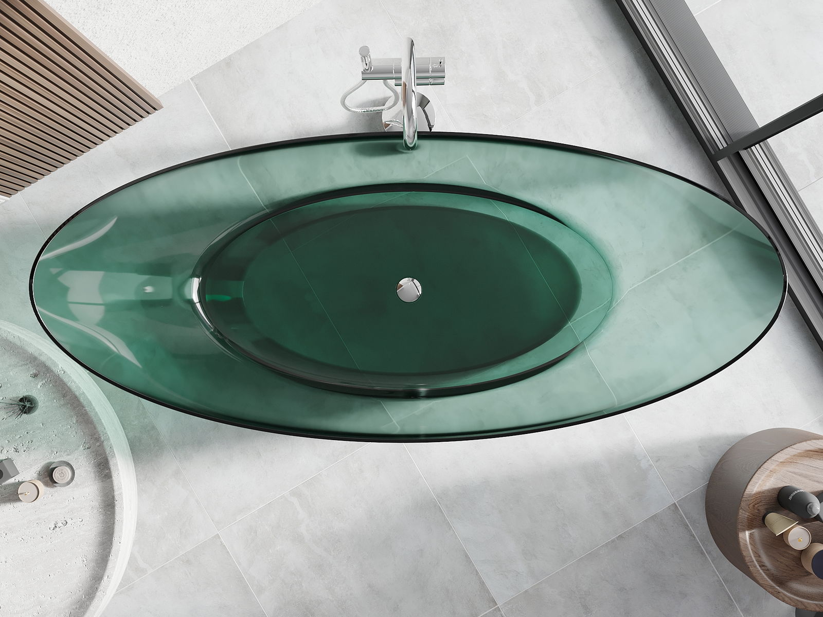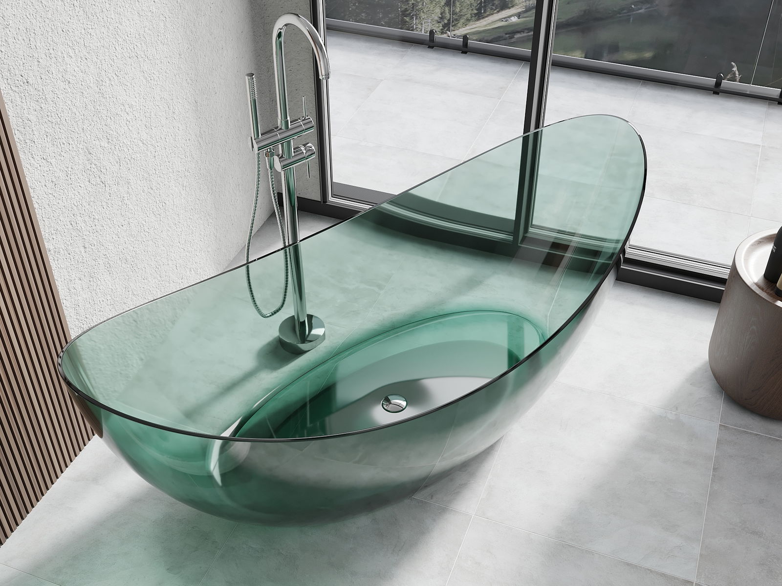 É um material moderno que combina uma aparência elegante com alta durabilidade. É resistente a danos mecânicos, fácil de limpar e agradável ao toque. A forma transparente e a borda fina da banheira conferem-lhe leveza e um caráter único, criando um destaque impressionante na decoração da casa de banho.