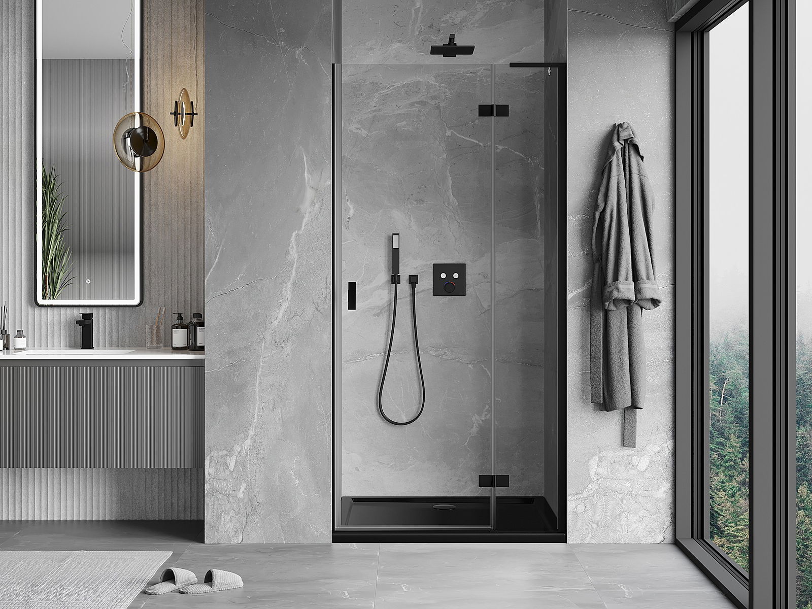 A pega prática e confortável foi feita de metal durável e resistente. A forma moderna combinada com o acabamento ajustado à cor dos perfis confere a todo o conjunto uma aparência moderna e estilosa, realçando a estética de qualquer casa de banho.
