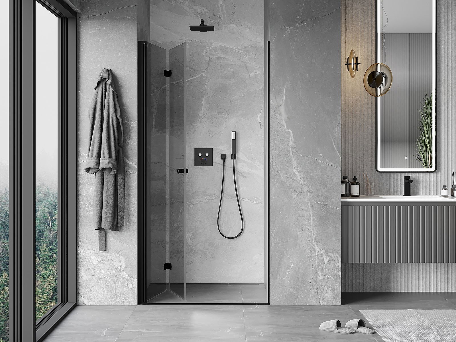 A pega prática e confortável foi feita de metal durável e resistente. A forma moderna combinada com o acabamento ajustado à cor dos perfis confere a todo o conjunto uma aparência moderna e estilosa, realçando a estética de qualquer casa de banho.
