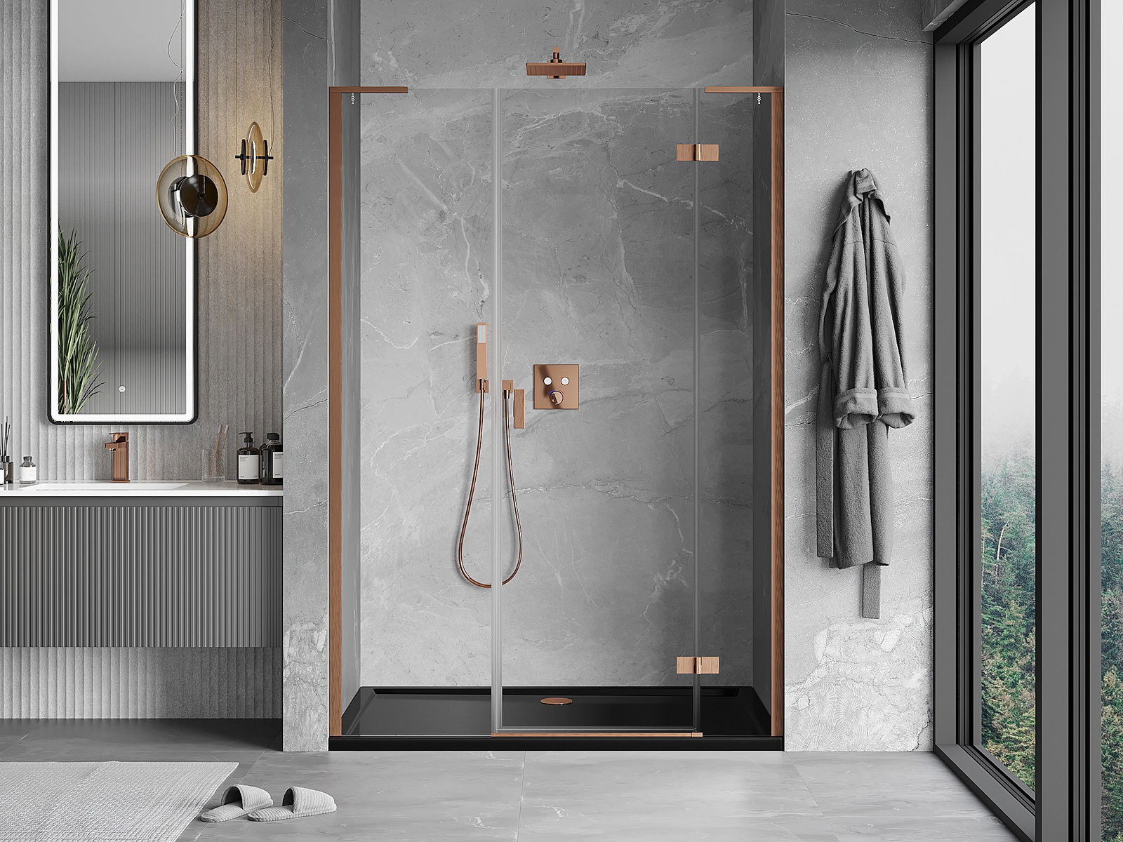 Mexen Mist-H L porta de chuveiro giratória direita 140 cm, transparente, cobre escovado - 8A5L-140-001-65-00-P