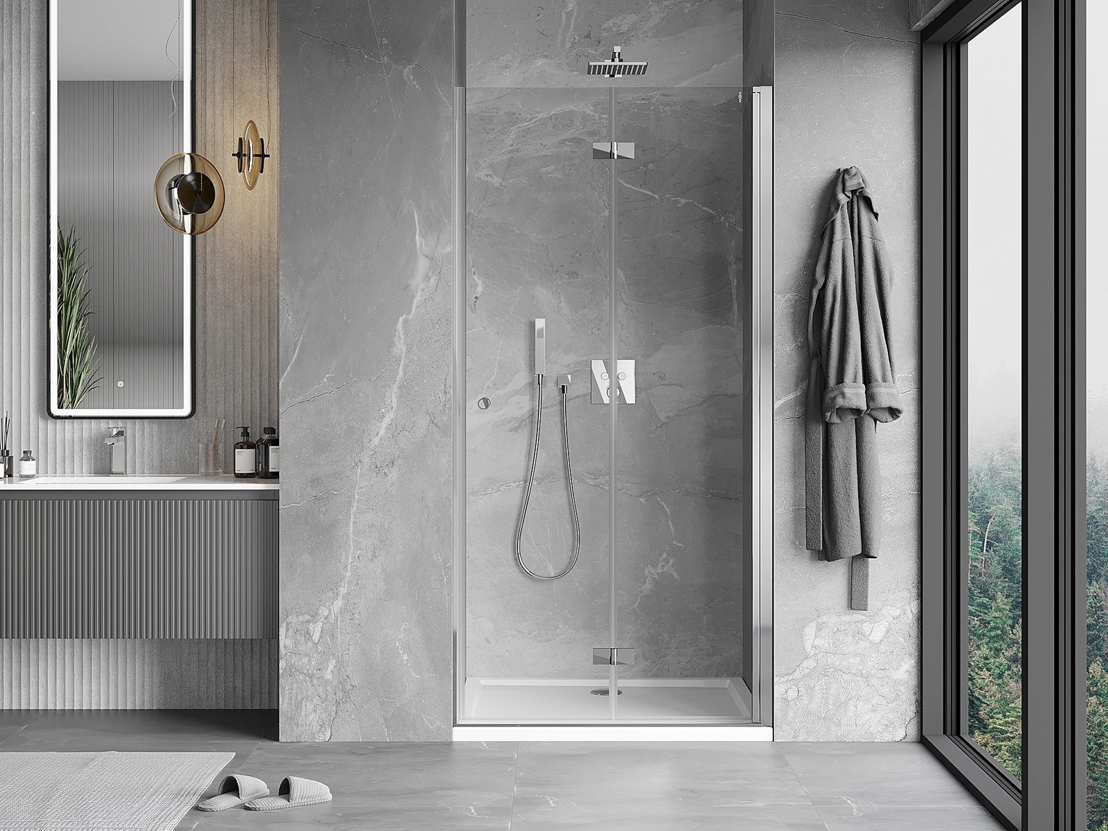 A pega prática e confortável foi feita de metal durável e resistente. A forma moderna combinada com o acabamento ajustado à cor dos perfis confere a todo o conjunto uma aparência moderna e estilosa, realçando a estética de qualquer casa de banho.