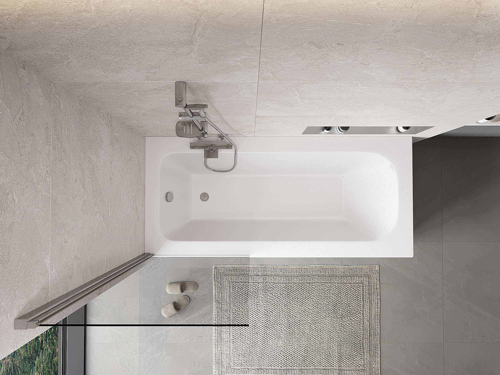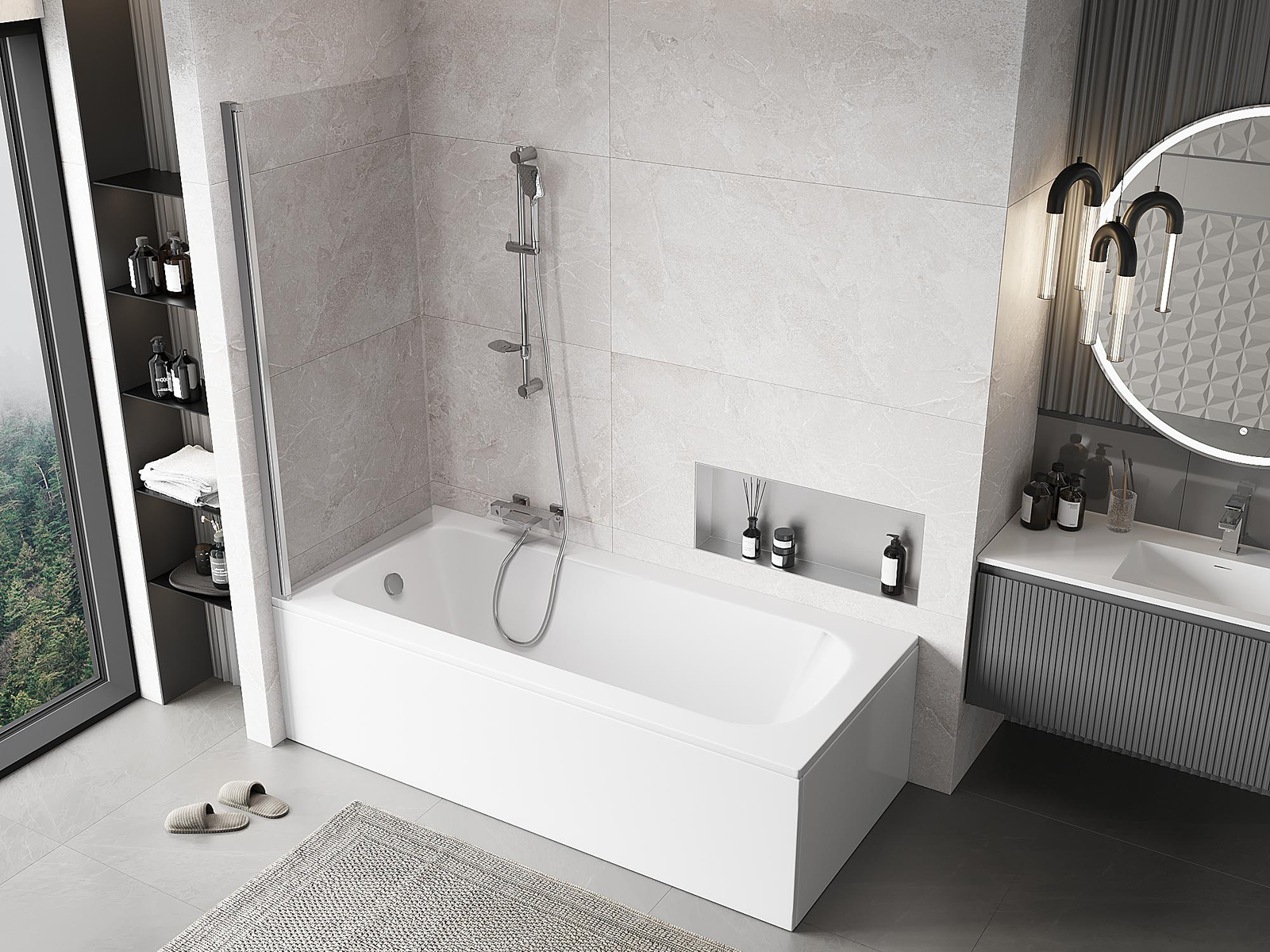 Proteção eficaz contra o derramamento de água durante o banho. O parapeito possui vedações que se ajustam perfeitamente à superfície do vidro e à borda da banheira. Solução funcional que garante segurança e fácil manutenção da limpeza.