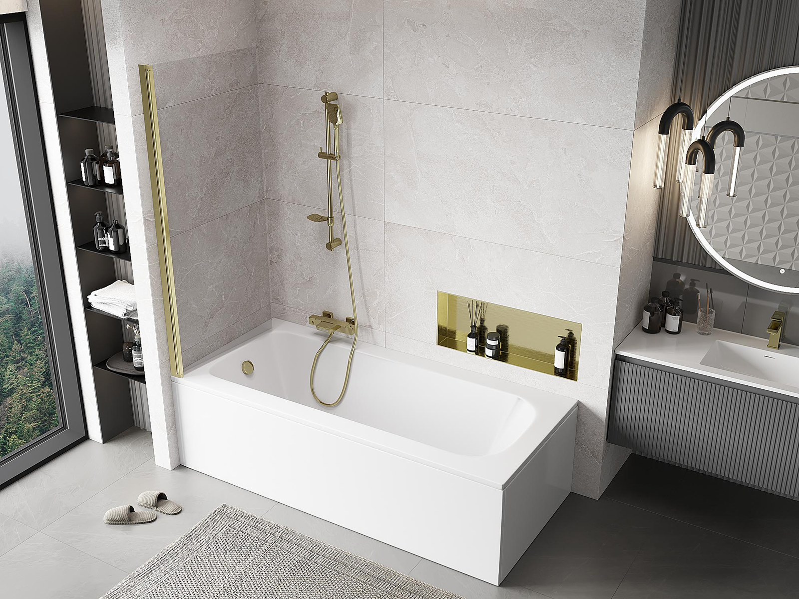 Proteção eficaz contra o derramamento de água durante o banho. O parapeito possui vedações que se ajustam perfeitamente à superfície do vidro e à borda da banheira. Solução funcional que garante segurança e fácil manutenção da limpeza.