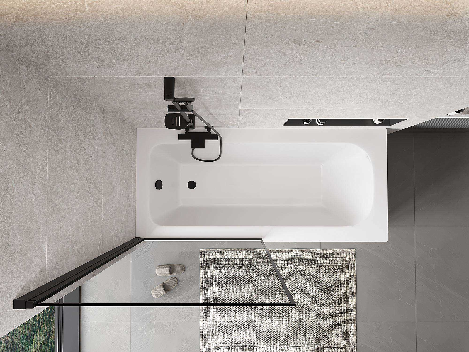 Proteção eficaz contra o derramamento de água durante o banho. O parapeito possui vedações que se ajustam perfeitamente à superfície do vidro e à borda da banheira. Solução funcional que garante segurança e fácil manutenção da limpeza.