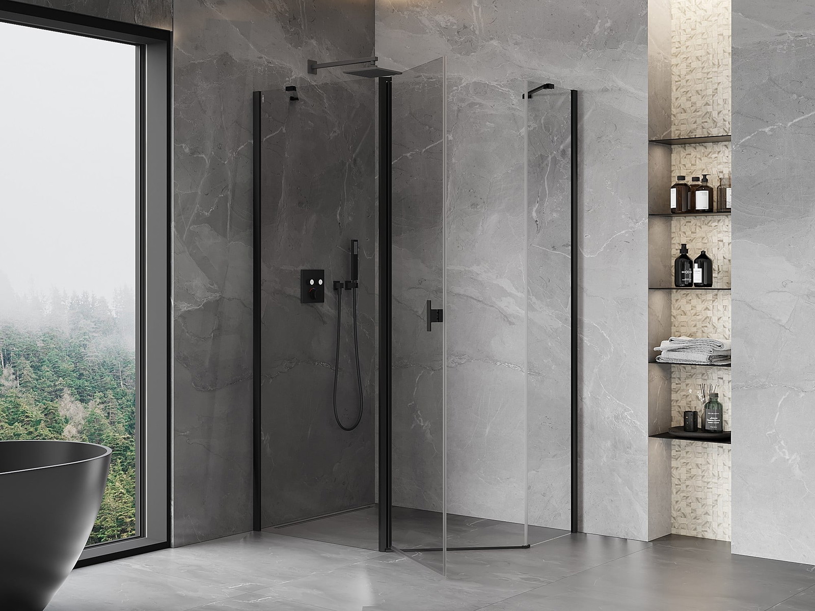 Mexen Mist cabine de duche pentagonal assimétrica com porta de abrir 100 x 90 cm, transparente, preta - 8A8-100-090-70-00