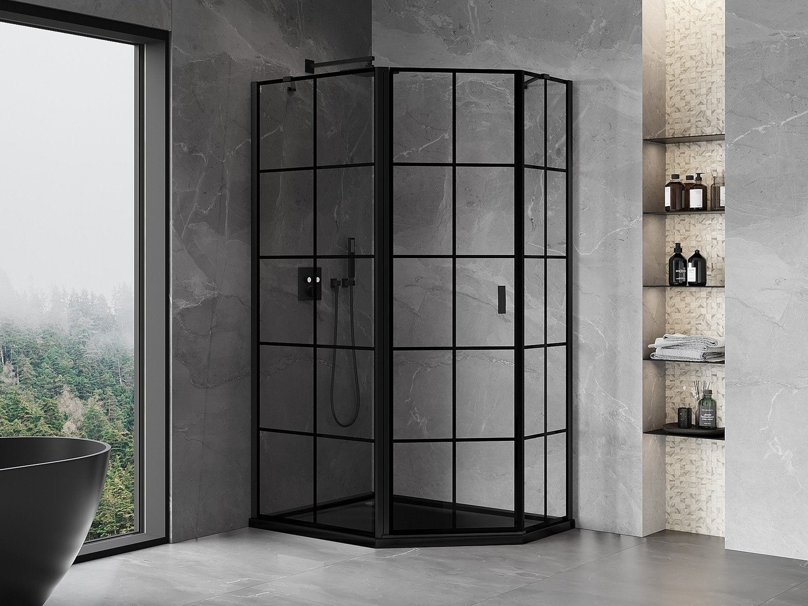 Mexen Mist cabine de duche pentagonal assimétrica com dobradiça à esquerda 90 x 80 cm, grelha preta, preta