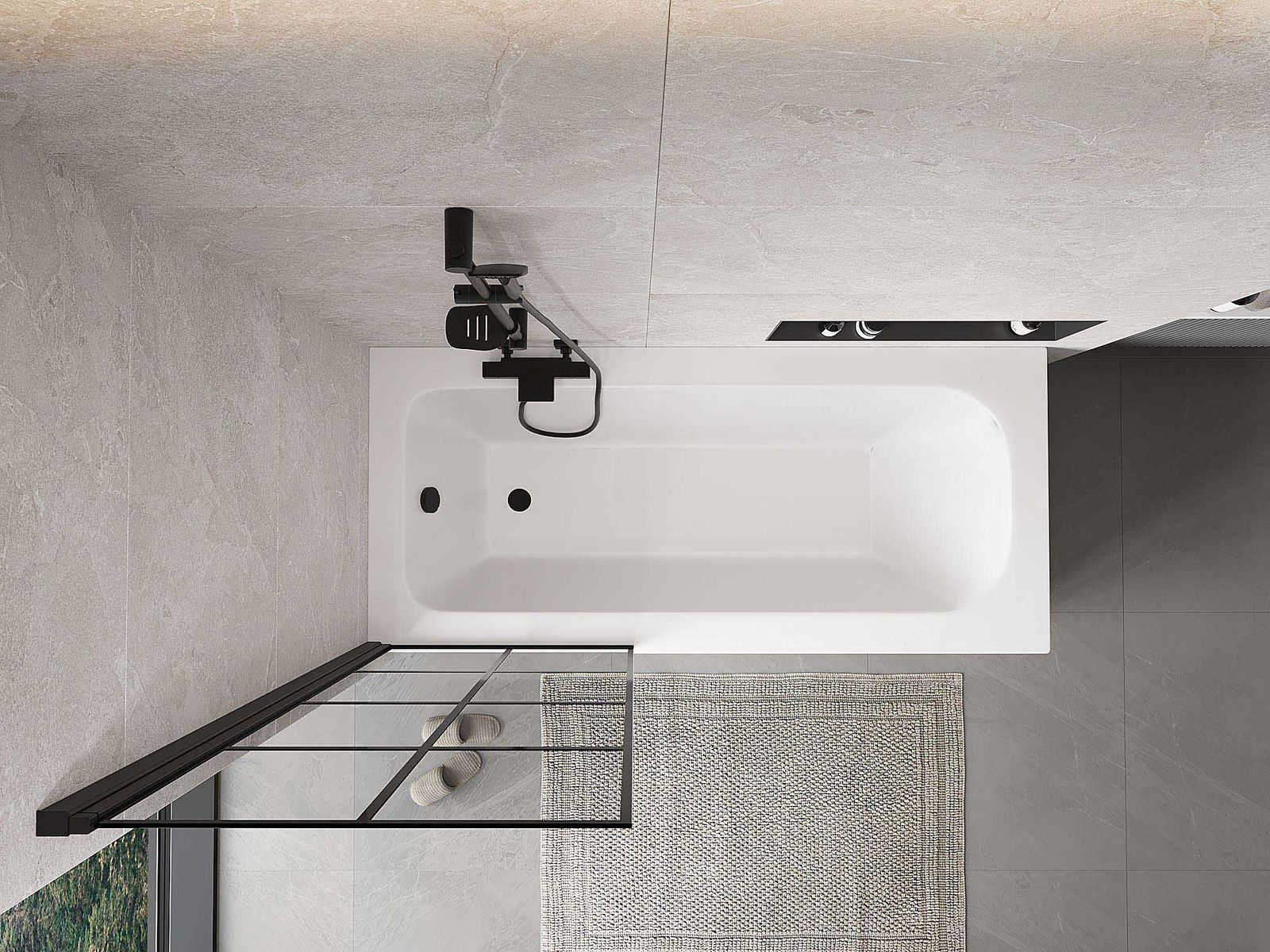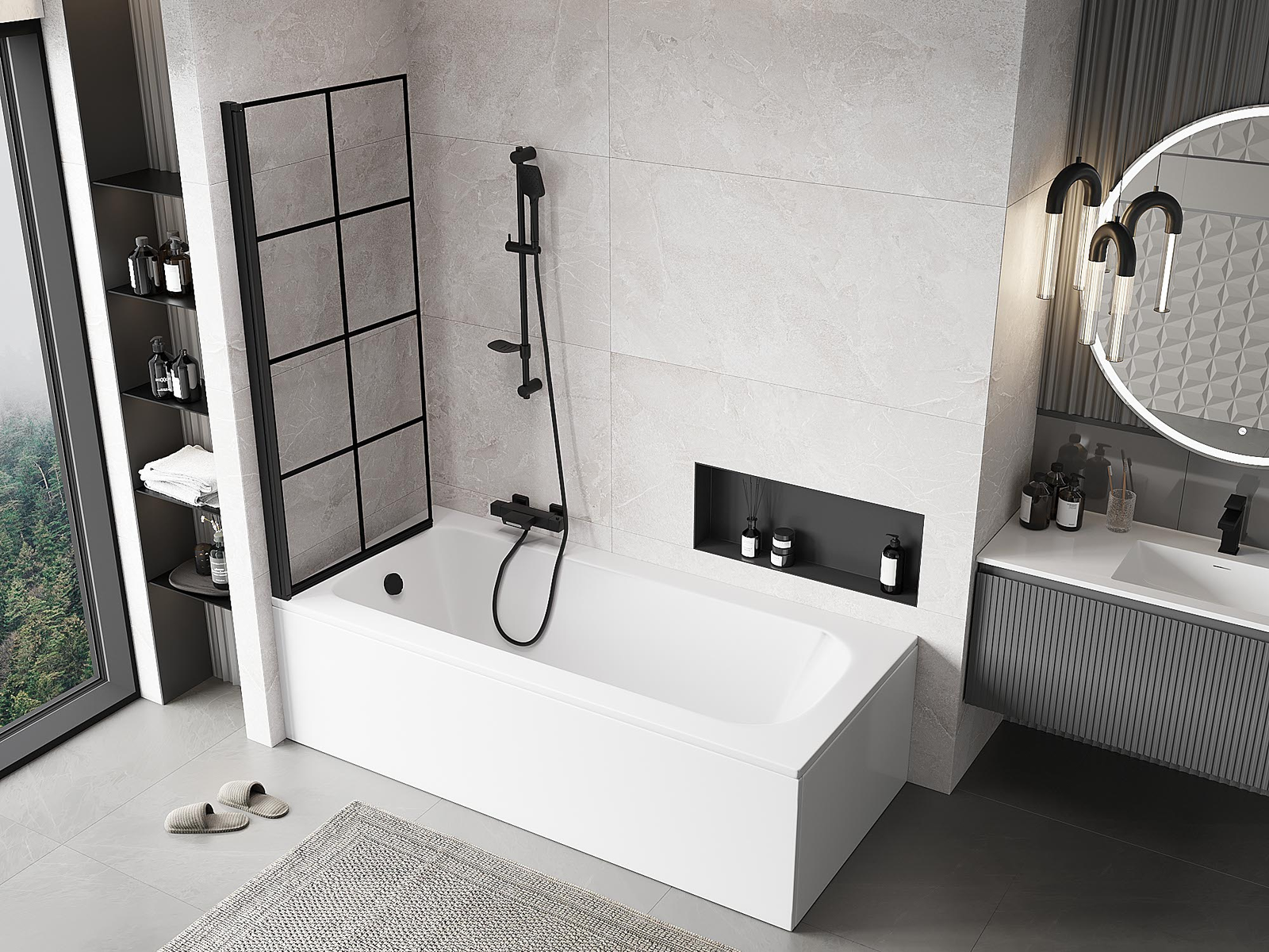 Proteção eficaz contra o derramamento de água durante o banho. O parapeito possui vedações que se ajustam perfeitamente à superfície do vidro e à borda da banheira. Solução funcional que garante segurança e fácil manutenção da limpeza.
