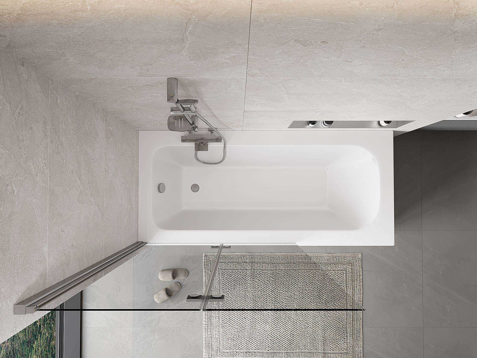 Écrã feito de duas portas com possibilidade de dobrar. Esta solução permite economizar mais espaço na casa de banho e permite o uso livre do espaço restante quando não estamos a usar a área de banho.