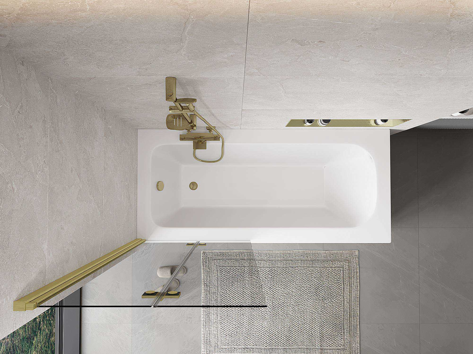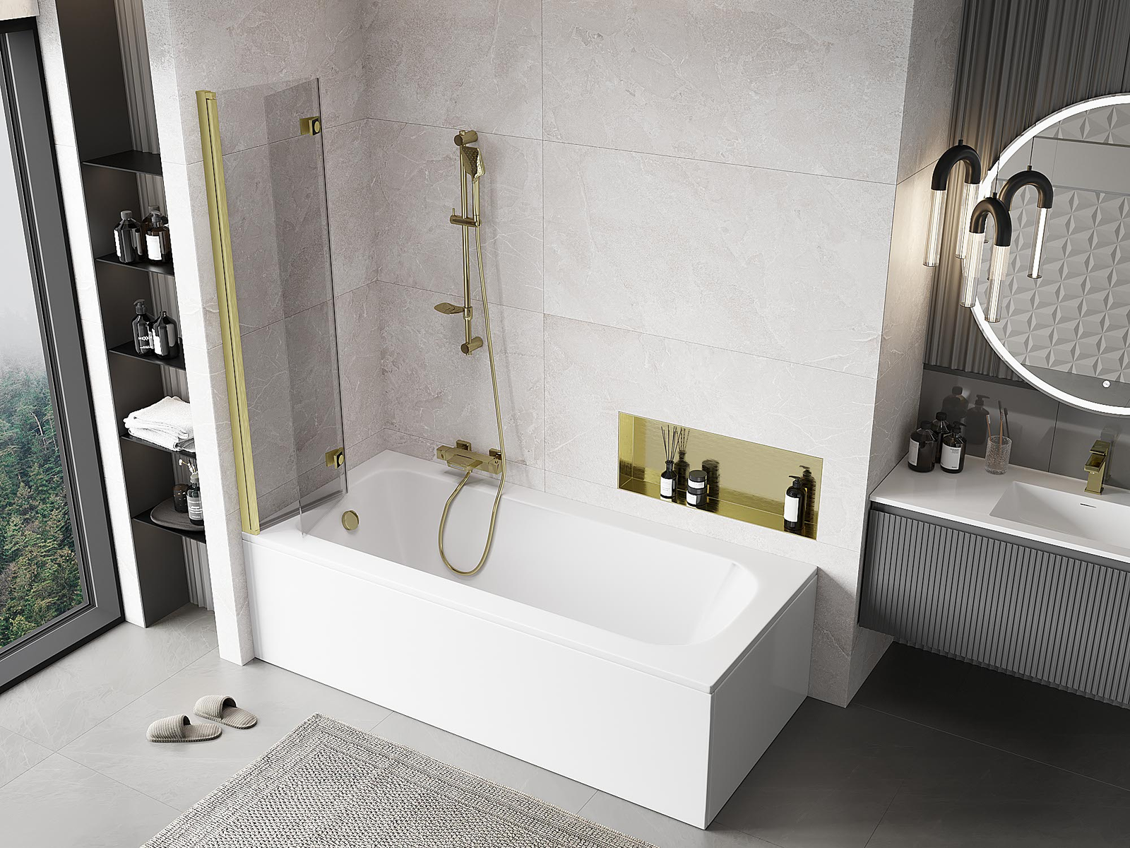 Proteção eficaz contra o derramamento de água durante o banho. O parapeito possui vedações que se ajustam perfeitamente à superfície do vidro e à borda da banheira. Solução funcional que garante segurança e fácil manutenção da limpeza.