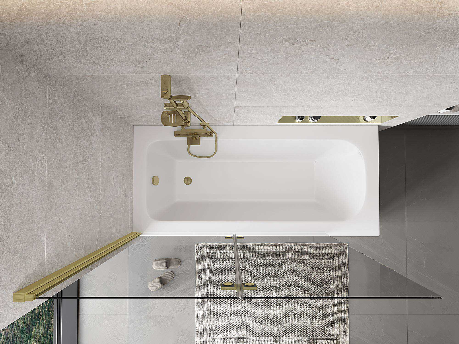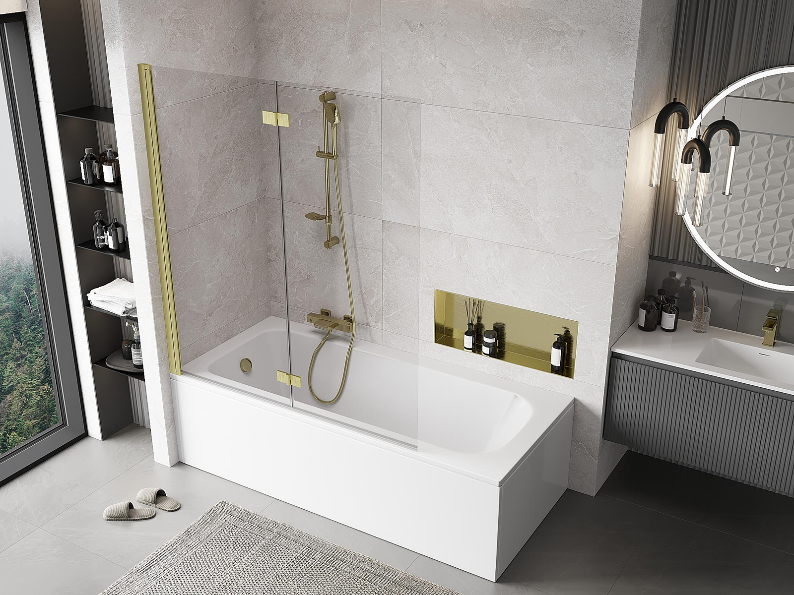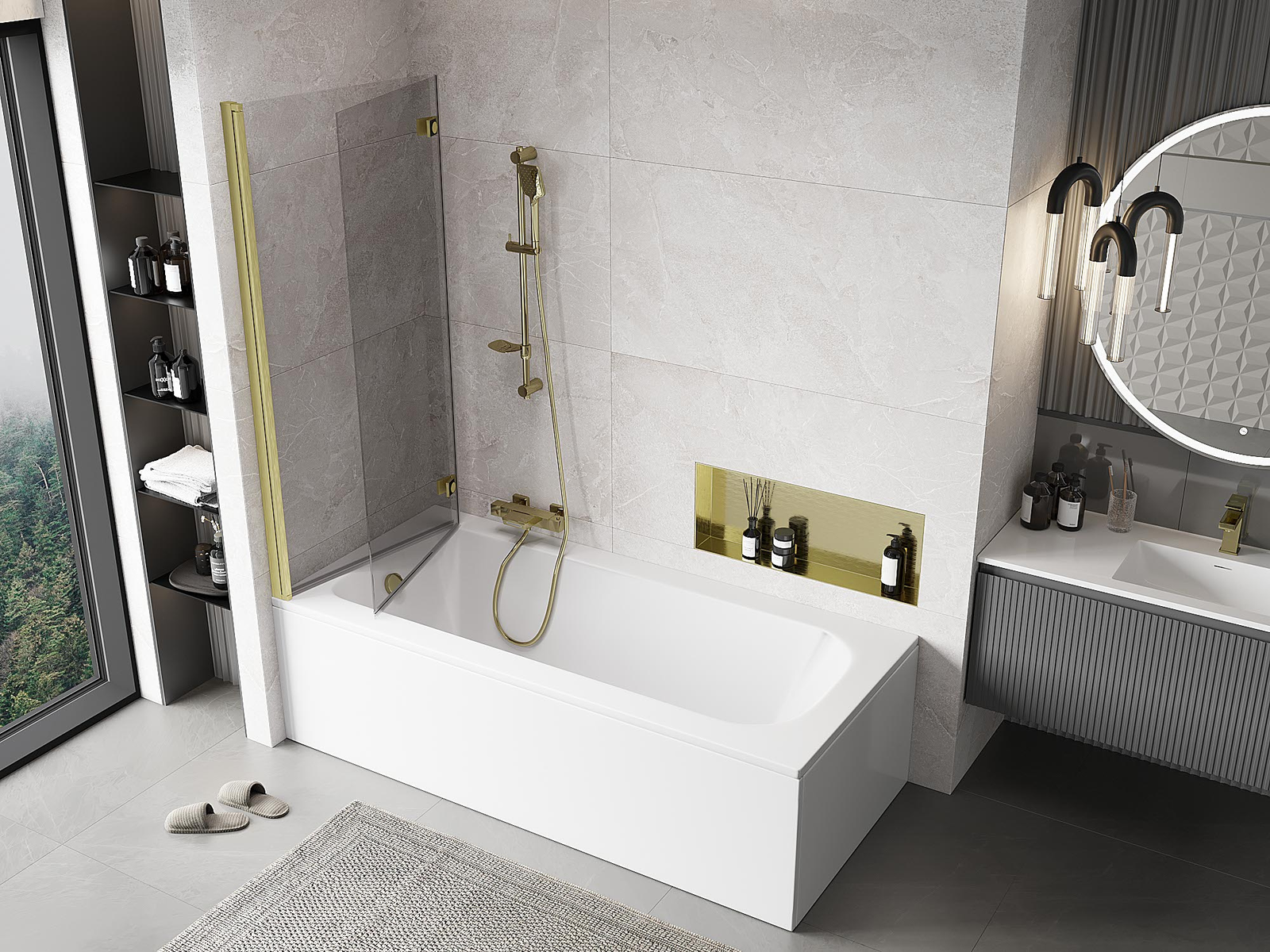 Proteção eficaz contra o derramamento de água durante o banho. O parapeito possui vedações que se ajustam perfeitamente à superfície do vidro e à borda da banheira. Solução funcional que garante segurança e fácil manutenção da limpeza.