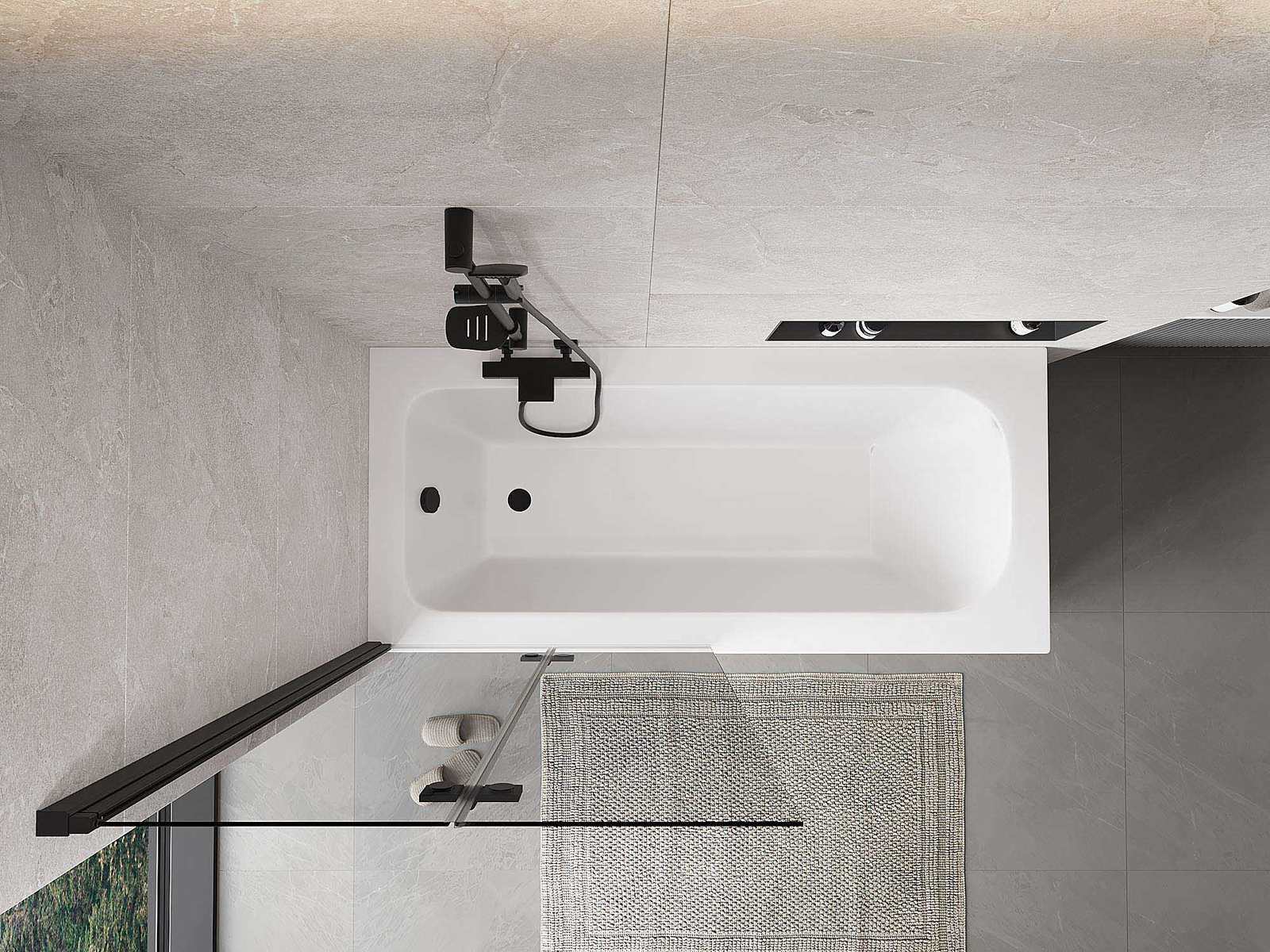 Écrã feito de duas portas com possibilidade de dobrar. Esta solução permite economizar mais espaço na casa de banho e permite o uso livre do espaço restante quando não estamos a usar a área de banho.