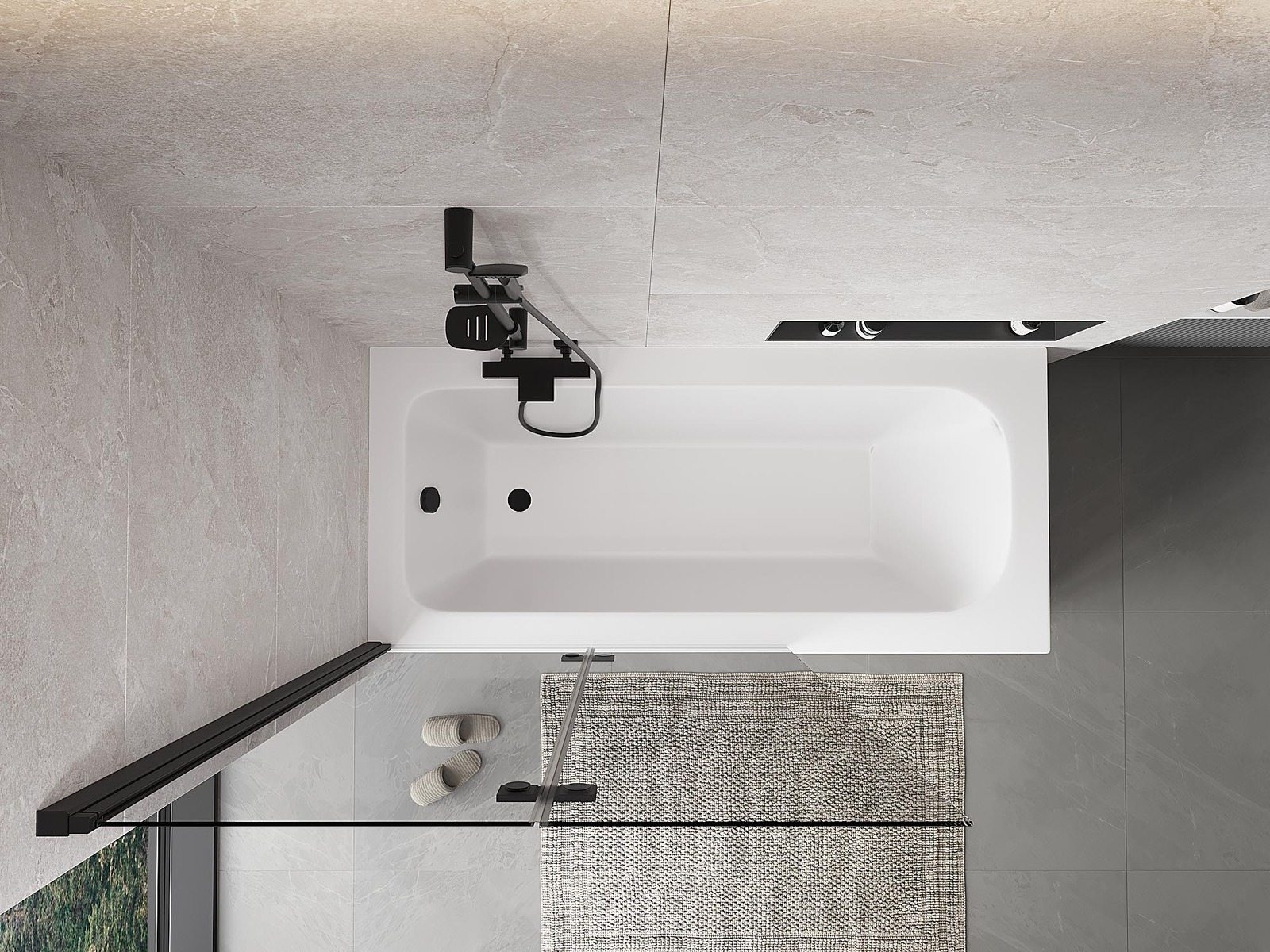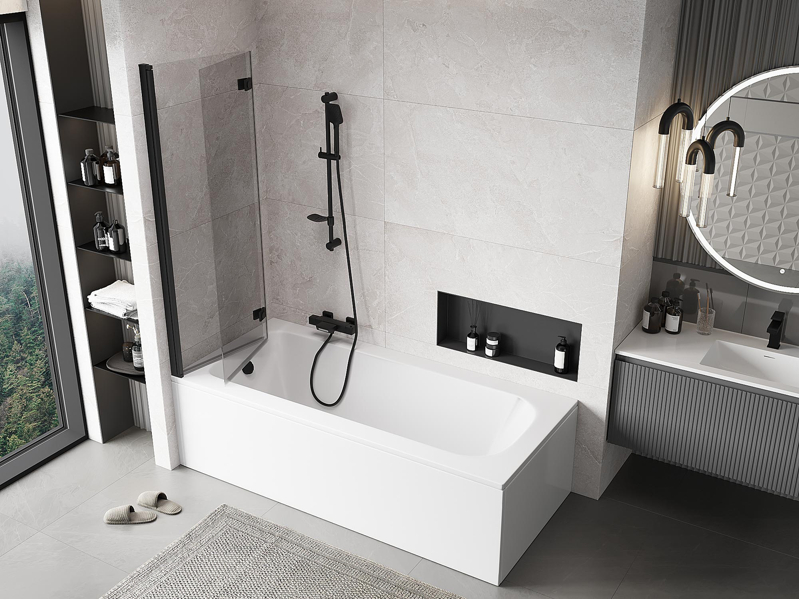 Proteção eficaz contra o derramamento de água durante o banho. O parapeito possui vedações que se ajustam perfeitamente à superfície do vidro e à borda da banheira. Solução funcional que garante segurança e fácil manutenção da limpeza.