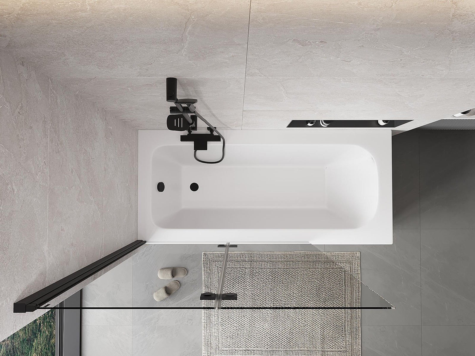 Proteção eficaz contra o derramamento de água durante o banho. O parapeito possui vedações que se ajustam perfeitamente à superfície do vidro e à borda da banheira. Solução funcional que garante segurança e fácil manutenção da limpeza.