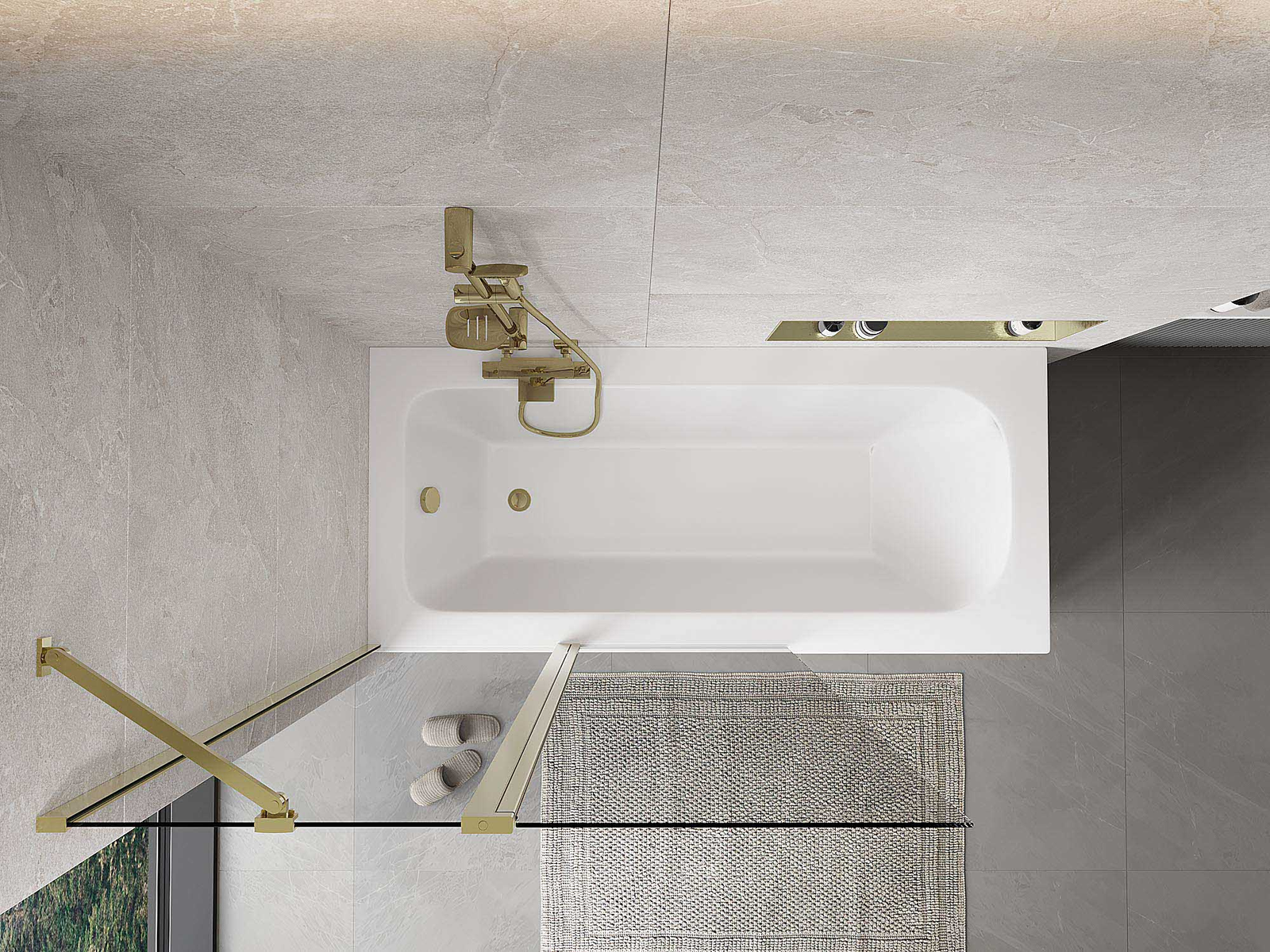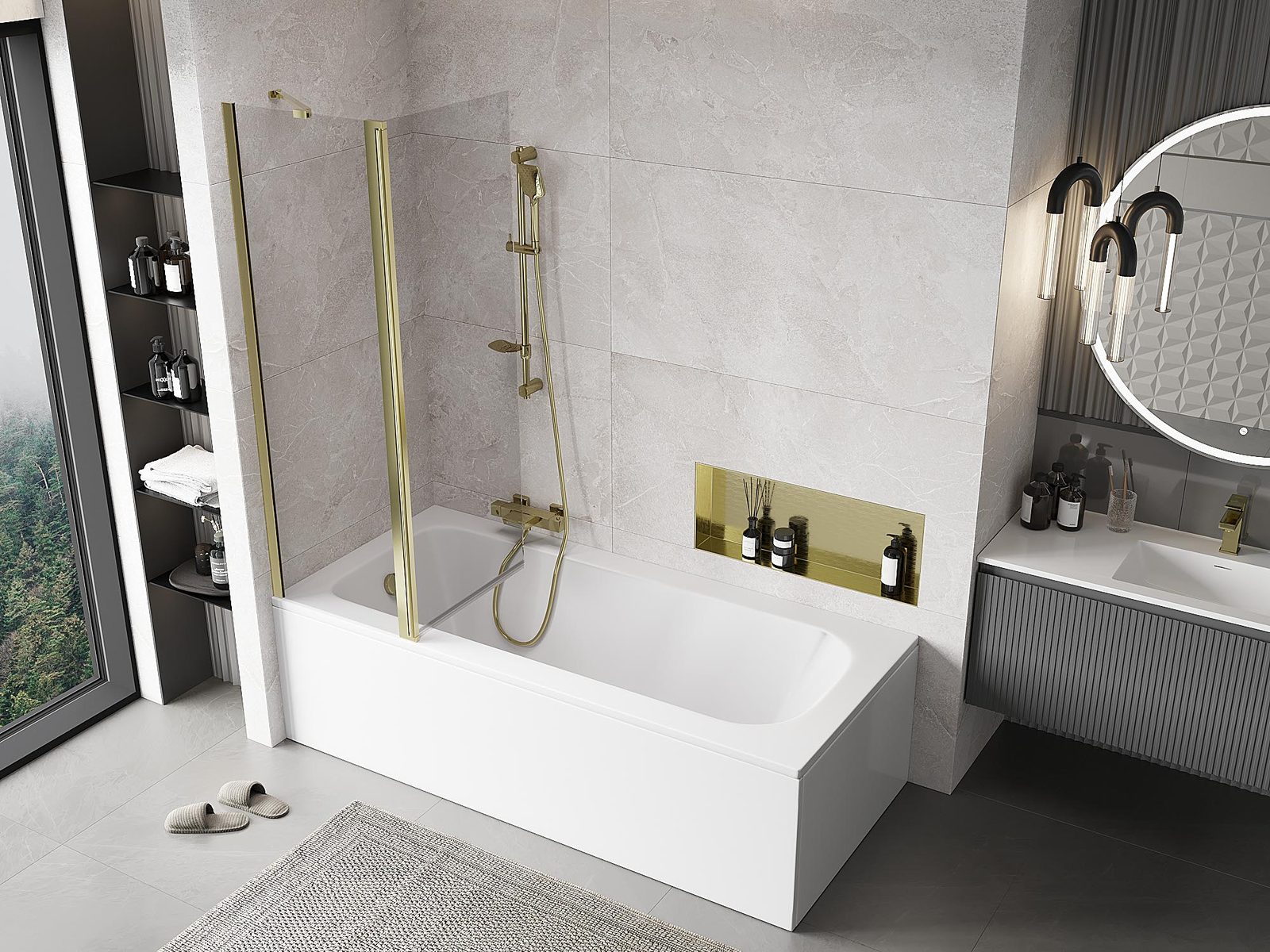 Proteção eficaz contra o derramamento de água durante o banho. O parapeito possui vedações que se ajustam perfeitamente à superfície do vidro e à borda da banheira. Solução funcional que garante segurança e fácil manutenção da limpeza.