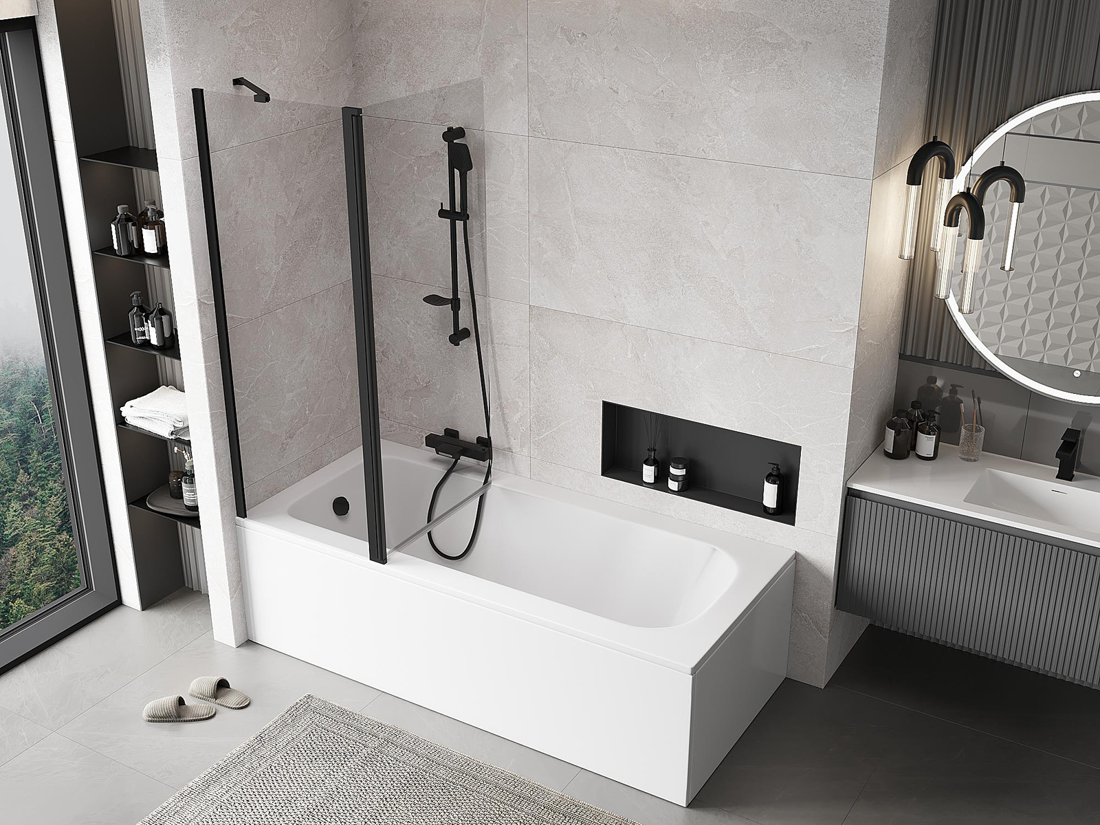 Proteção eficaz contra o derramamento de água durante o banho. O parapeito possui vedações que se ajustam perfeitamente à superfície do vidro e à borda da banheira. Solução funcional que garante segurança e fácil manutenção da limpeza.