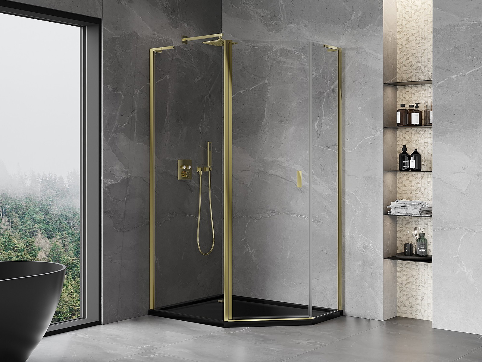 Mexen Mist L cabine de duche pentagonal assimétrica de abrir 100 x 90 cm, transparente, dourada - 8A8L-100-090-50-00