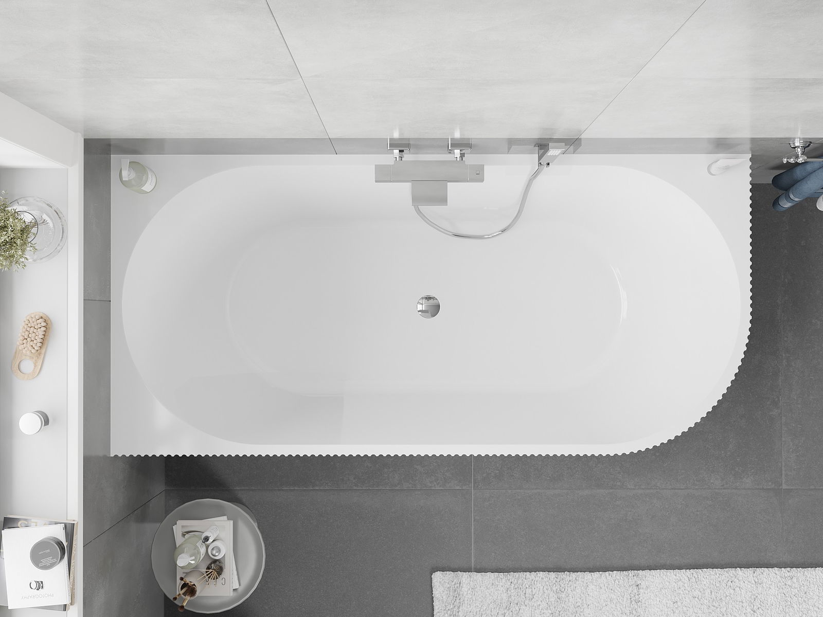 É um material moderno que combina uma aparência elegante com alta durabilidade. É resistente a danos mecânicos, fácil de limpar e agradável ao toque. A forma transparente e a borda fina da banheira conferem-lhe leveza e um caráter único, criando um destaque impressionante na decoração da casa de banho.