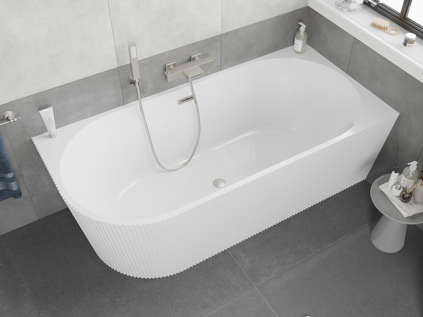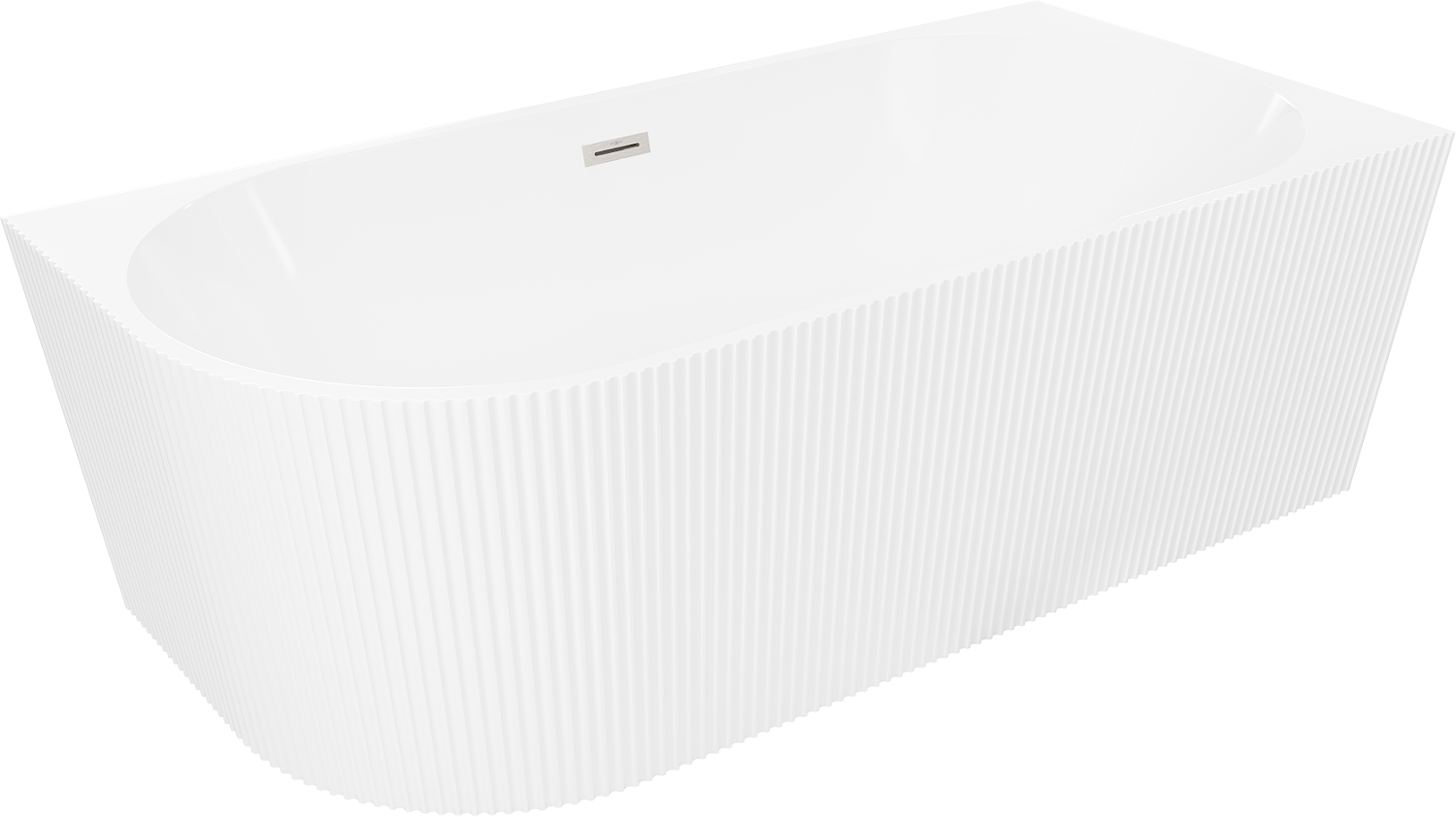 Mexen Silo banheira independente angular direita com textura canelada 150 x 75 cm, branca, transbordo níquel escovado