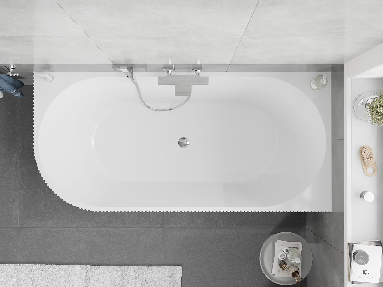 Inclui-se um sifão com uma tampa klik-klak, o que permite abrir e fechar rapidamente a válvula de drenagem na banheira. Esqueça-se de procurar a tampa antes do banho! Basta um clique para parar ou drenar a água.