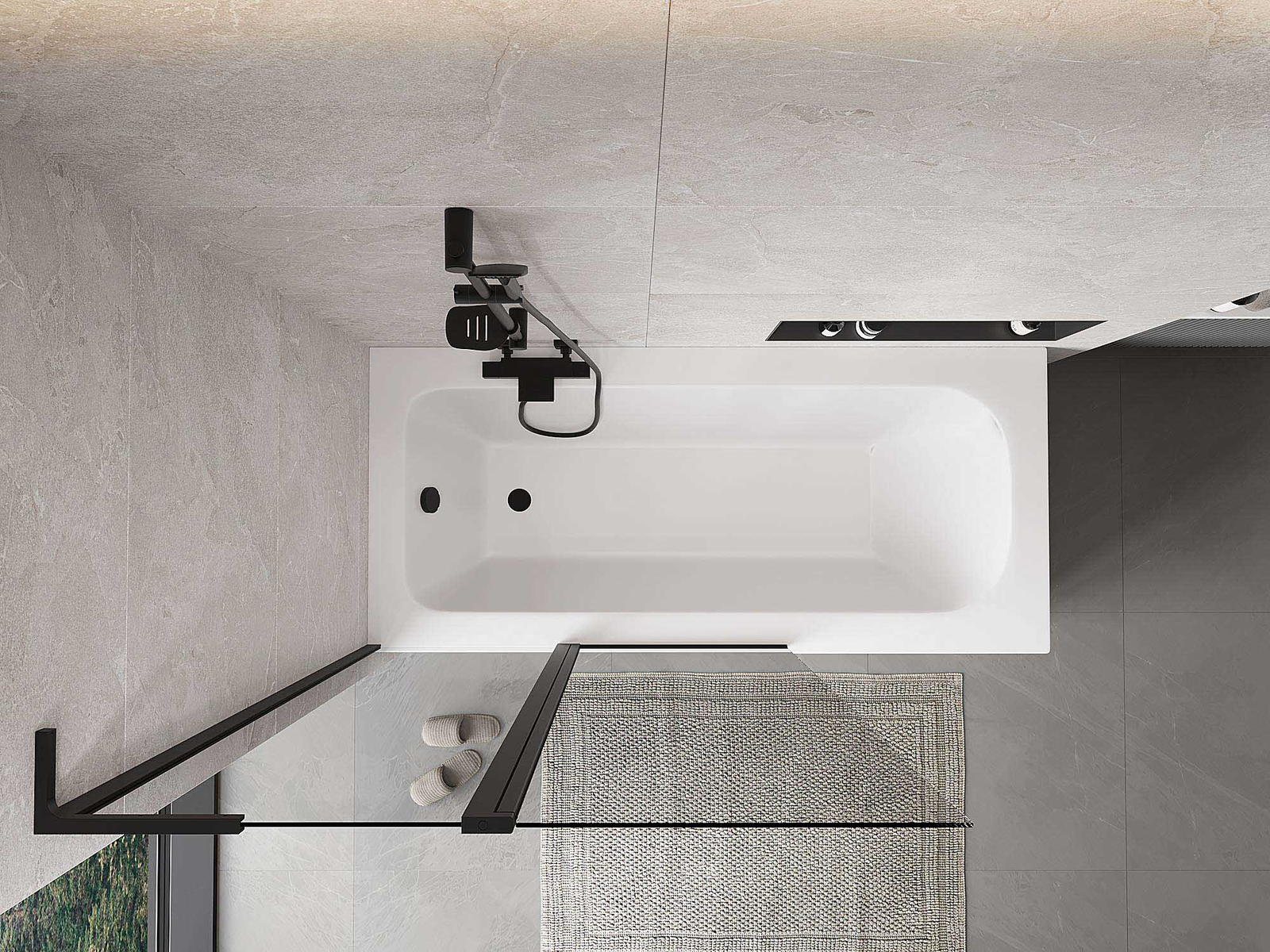 Proteção eficaz contra o derramamento de água durante o banho. O parapeito possui vedações que se ajustam perfeitamente à superfície do vidro e à borda da banheira. Solução funcional que garante segurança e fácil manutenção da limpeza.