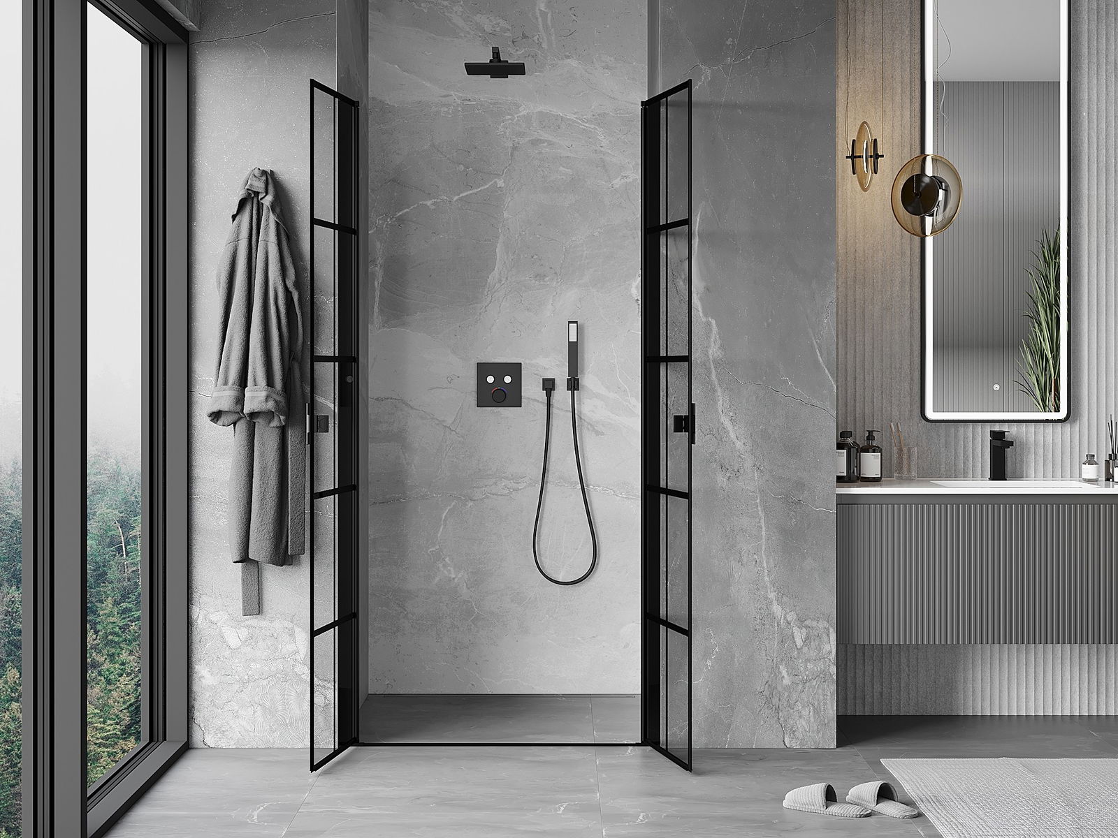 A pega prática e confortável foi feita de metal durável e resistente. A forma moderna combinada com o acabamento ajustado à cor dos perfis confere a todo o conjunto uma aparência moderna e estilosa, realçando a estética de qualquer casa de banho.