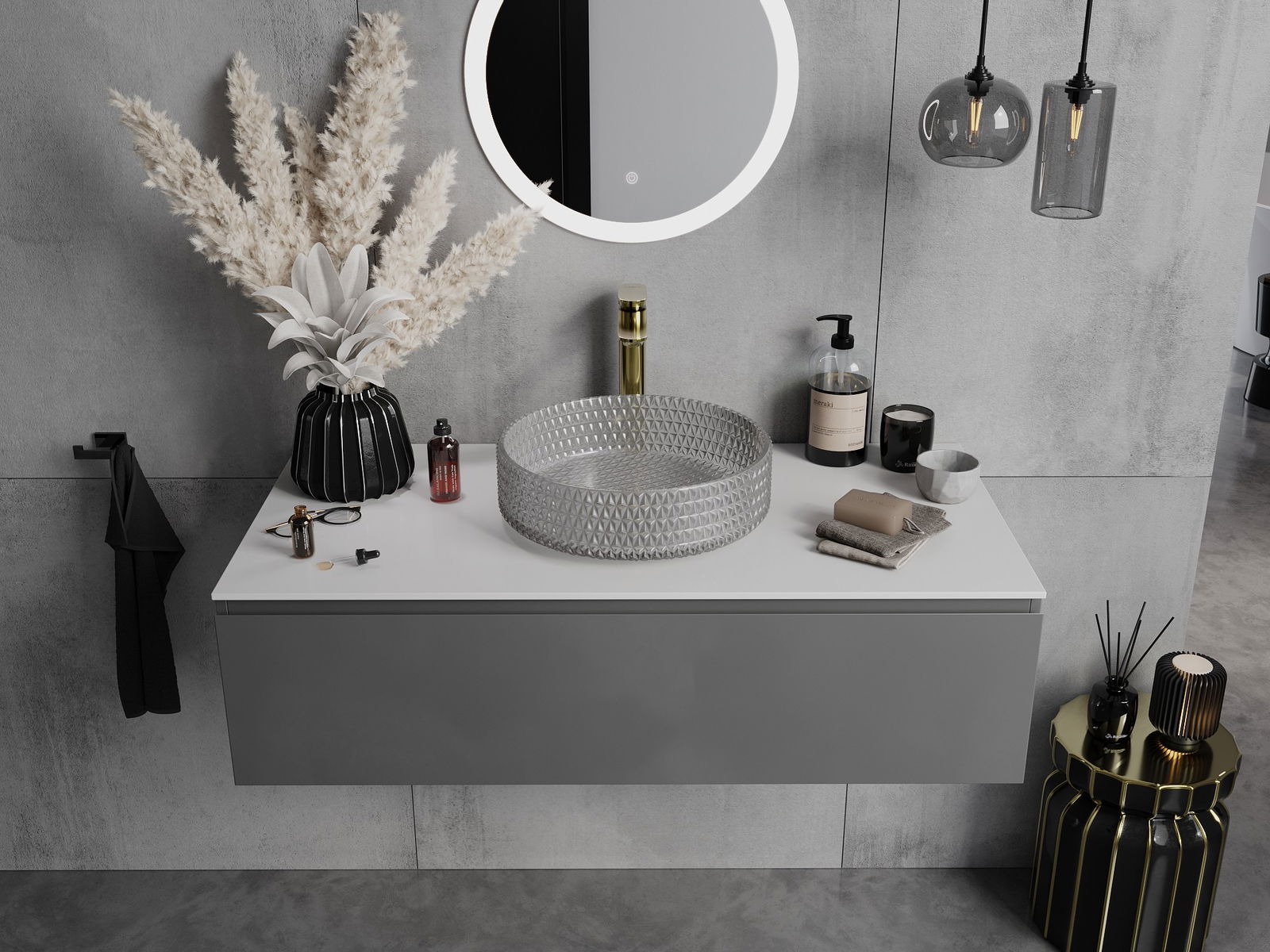 O lavatório destaca-se pela estrutura única de cristais, conferindo-lhe uma aparência inigualável e extremamente impressionante. Os cristais brilham à luz, atraindo a atenção e acrescentando elegância. Uma solução prática e estilosa para qualquer casa de banho.