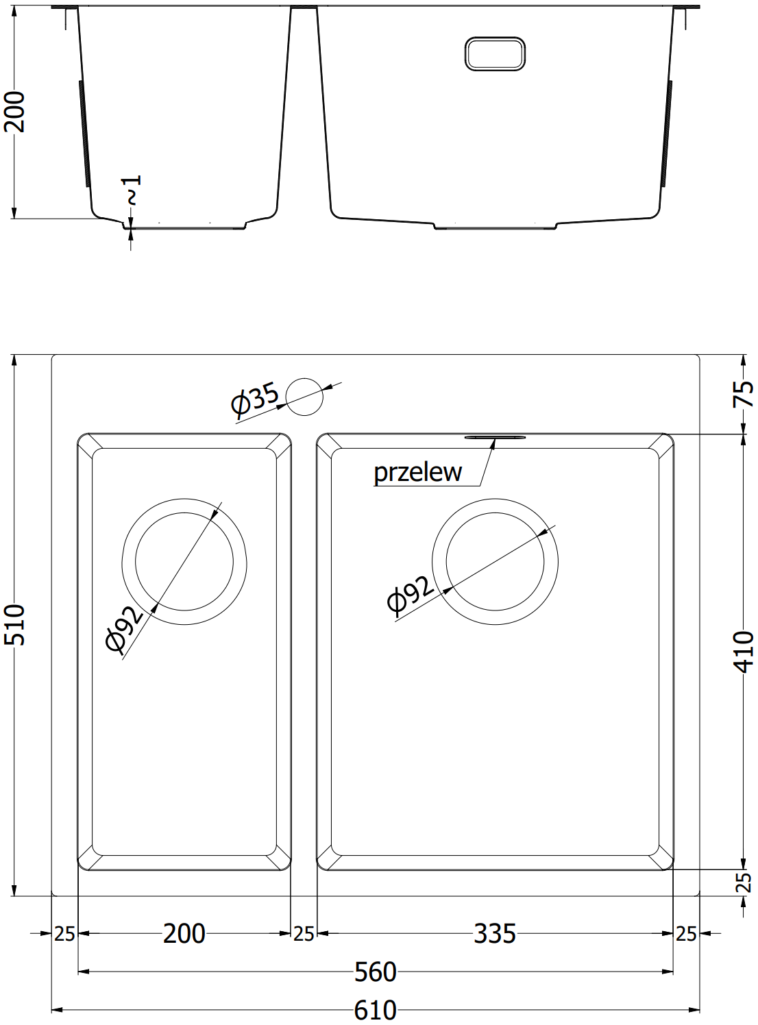 Dimensões da bacia: 410x335 mm (maior), 410x200 mm (menor)