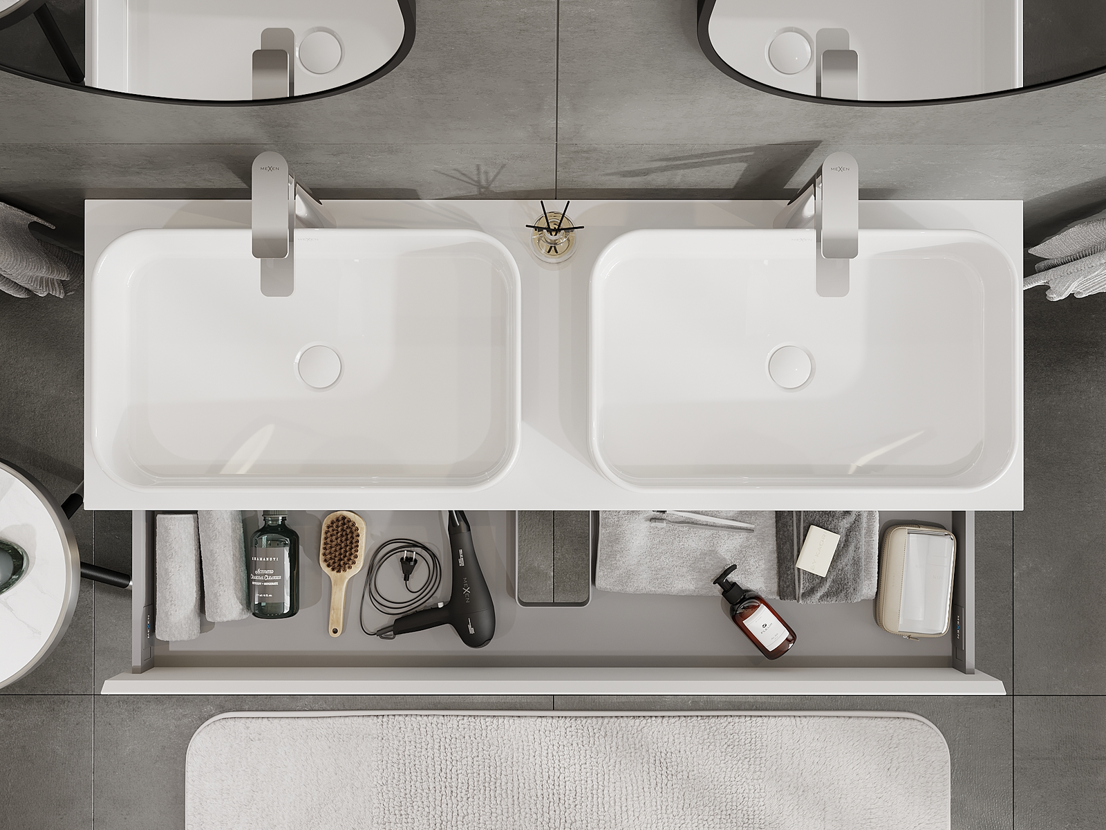 O recorte na gaveta é projetado de forma a acomodar o sifão, que é essencial em instalações de lavatórios. Graças a isso, o móvel pode ser montado de forma totalmente funcional, sem a necessidade de abdicar do espaço da gaveta em prol da instalação.