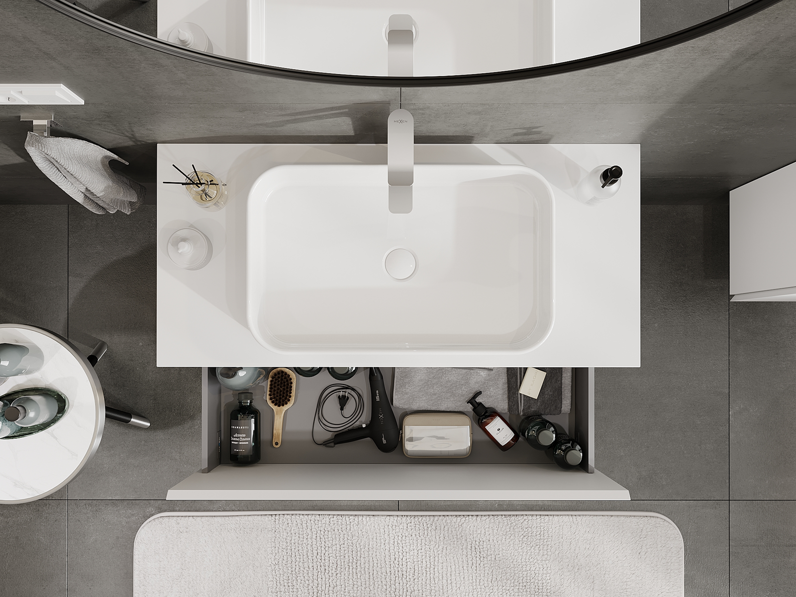 O recorte na gaveta é projetado de forma a acomodar o sifão, que é essencial em instalações de lavatórios. Graças a isso, o móvel pode ser montado de forma totalmente funcional, sem a necessidade de abdicar do espaço da gaveta em prol da instalação.