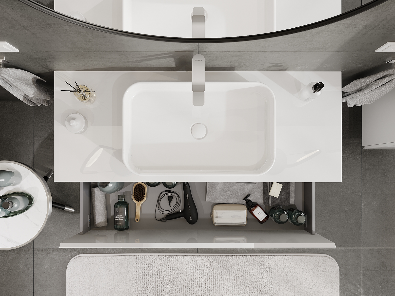 O recorte na gaveta é projetado de forma a acomodar o sifão, que é essencial em instalações de lavatórios. Graças a isso, o móvel pode ser montado de forma totalmente funcional, sem a necessidade de abdicar do espaço da gaveta em prol da instalação.
