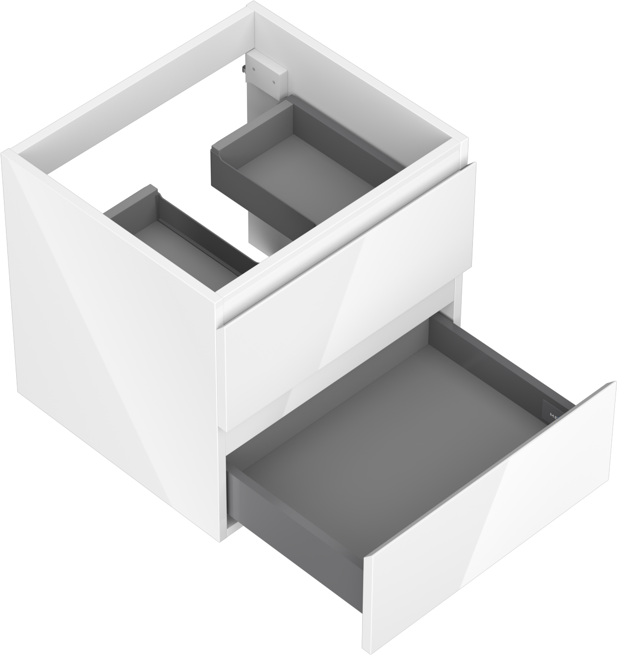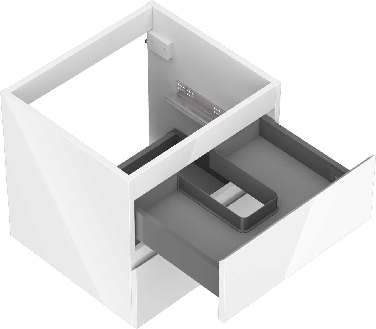O recorte na gaveta é projetado de forma a acomodar o sifão, que é essencial em instalações de lavatórios. Graças a isso, o móvel pode ser montado de forma totalmente funcional, sem a necessidade de abdicar do espaço da gaveta em prol da instalação.