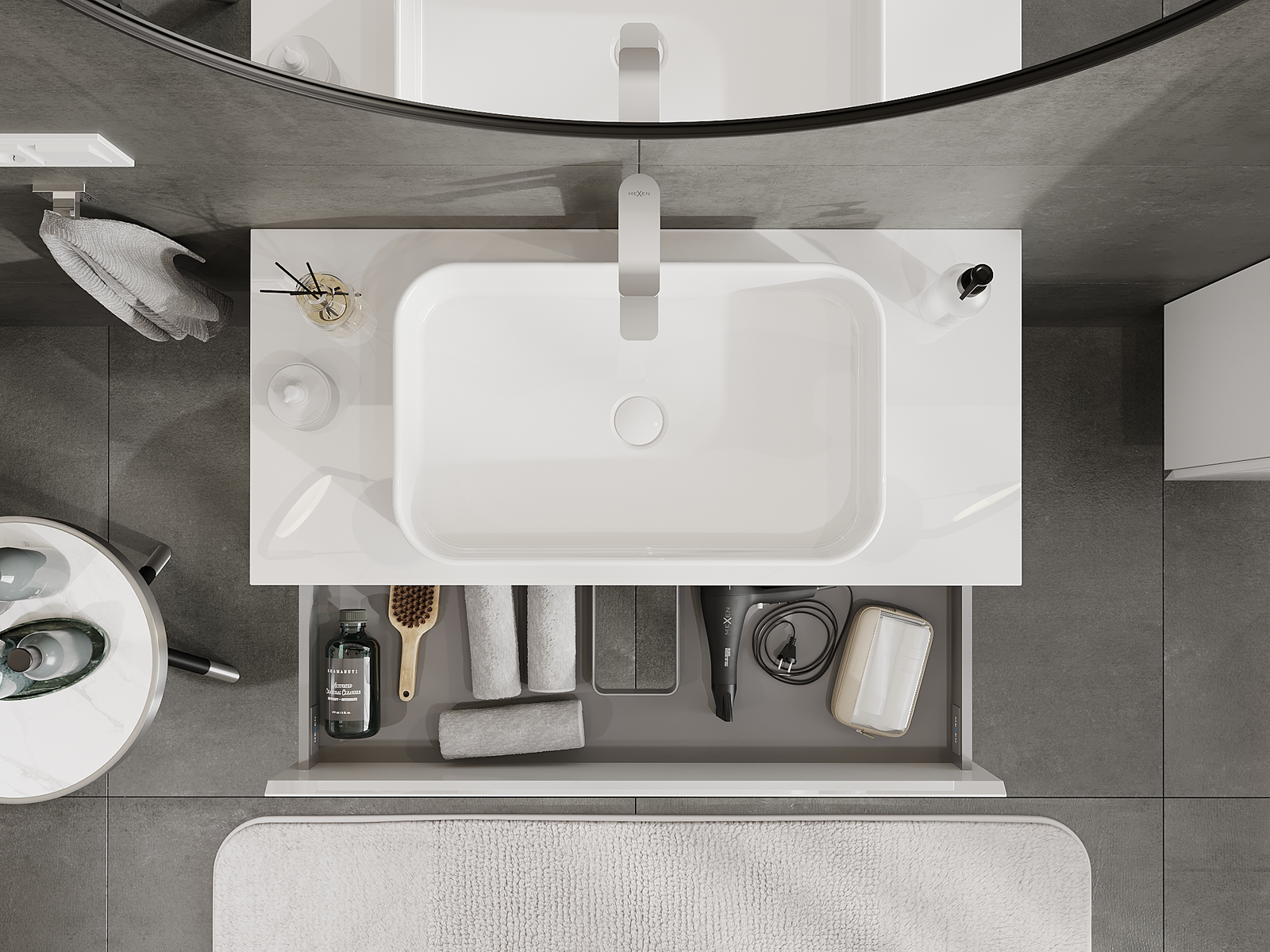 O recorte na gaveta é projetado de forma a acomodar o sifão, que é essencial em instalações de lavatórios. Graças a isso, o móvel pode ser montado de forma totalmente funcional, sem a necessidade de abdicar do espaço da gaveta em prol da instalação.