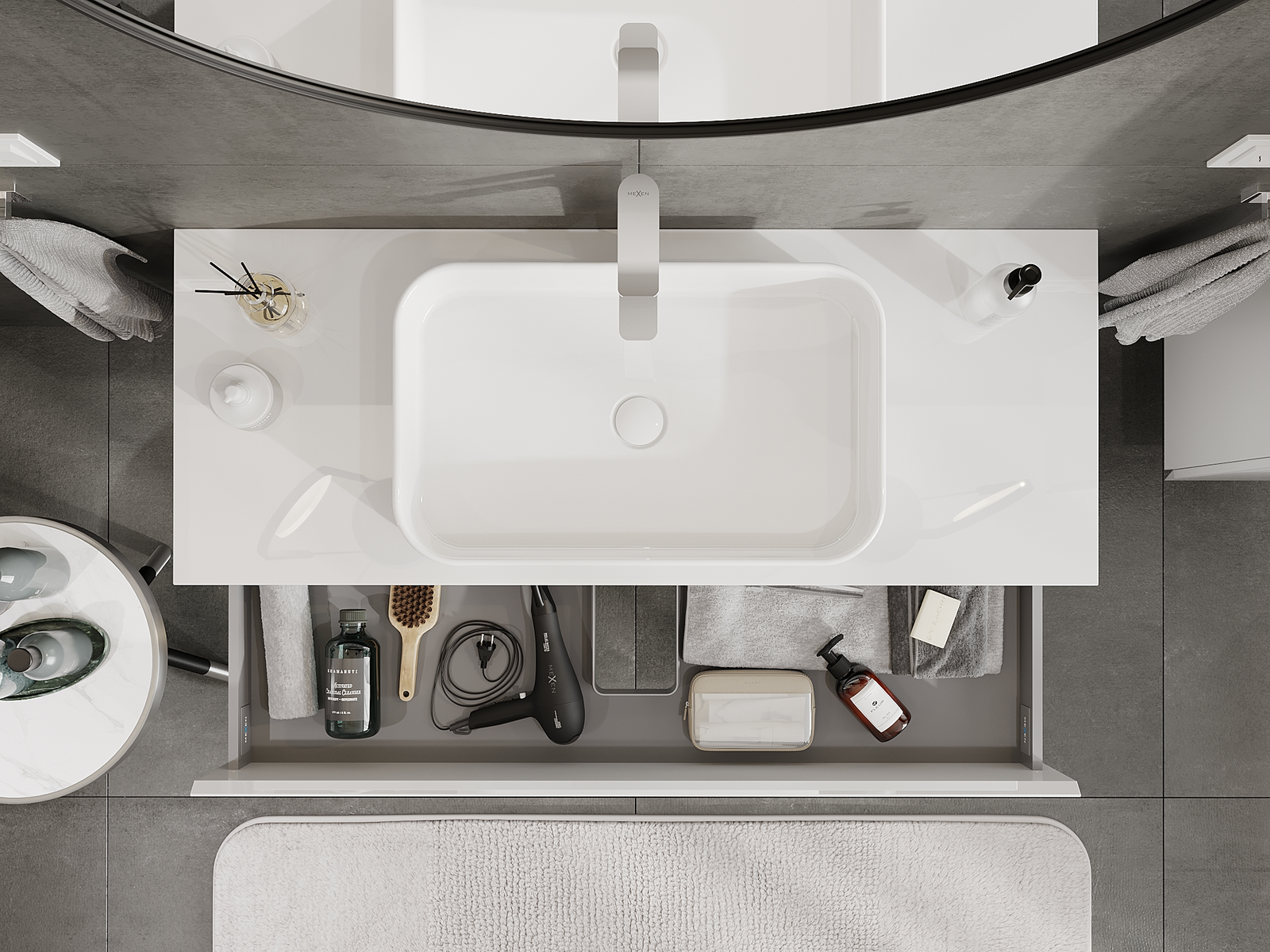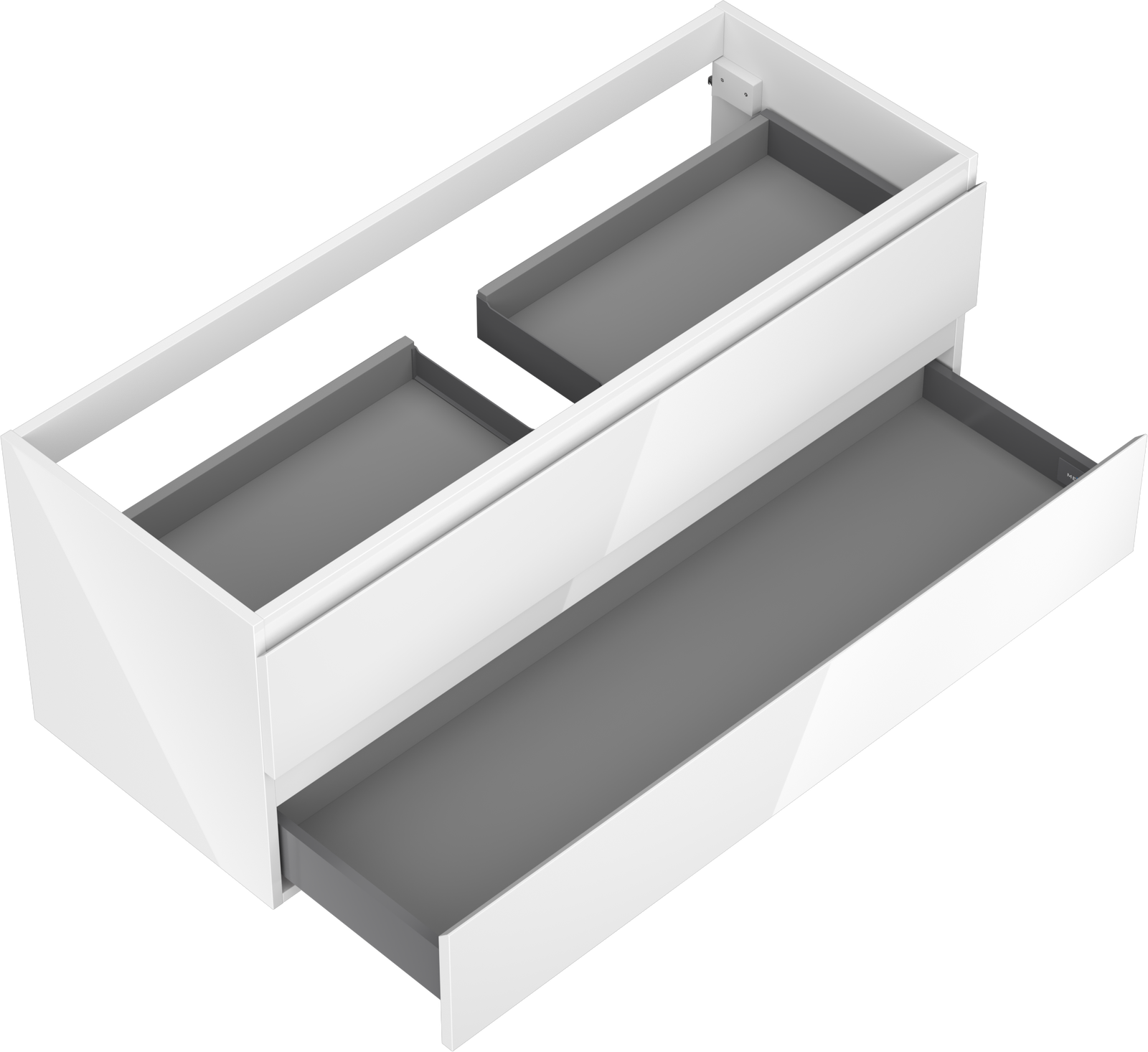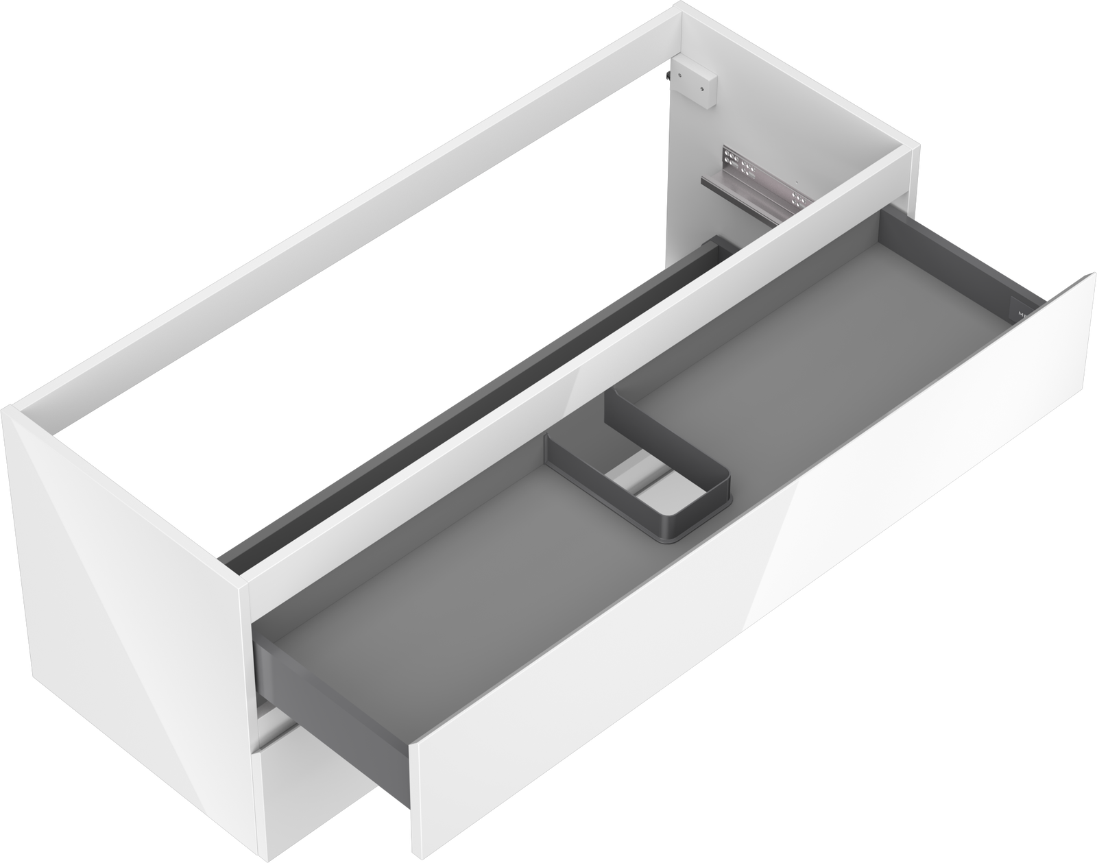 O recorte na gaveta é projetado de forma a acomodar o sifão, que é essencial em instalações de lavatórios. Graças a isso, o móvel pode ser montado de forma totalmente funcional, sem a necessidade de abdicar do espaço da gaveta em prol da instalação.
