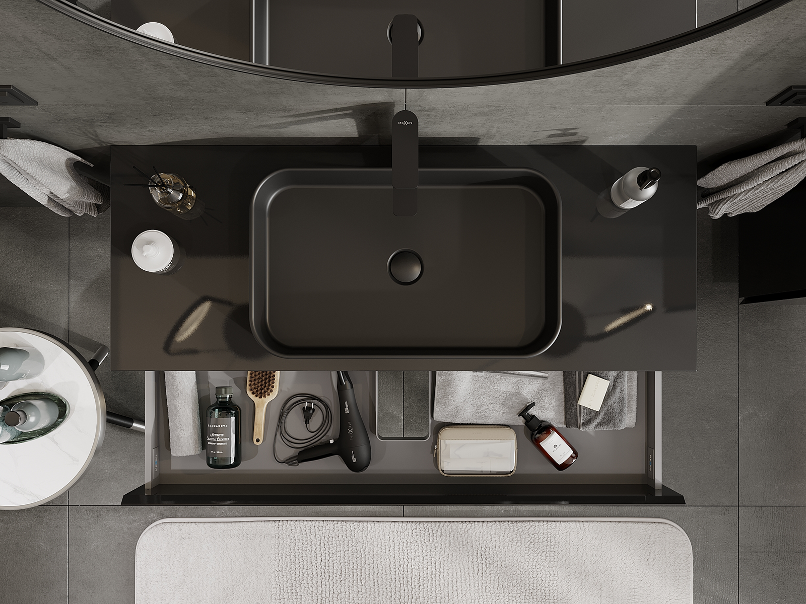 O recorte na gaveta é projetado de forma a acomodar o sifão, que é essencial em instalações de lavatórios. Graças a isso, o móvel pode ser montado de forma totalmente funcional, sem a necessidade de abdicar do espaço da gaveta em prol da instalação.