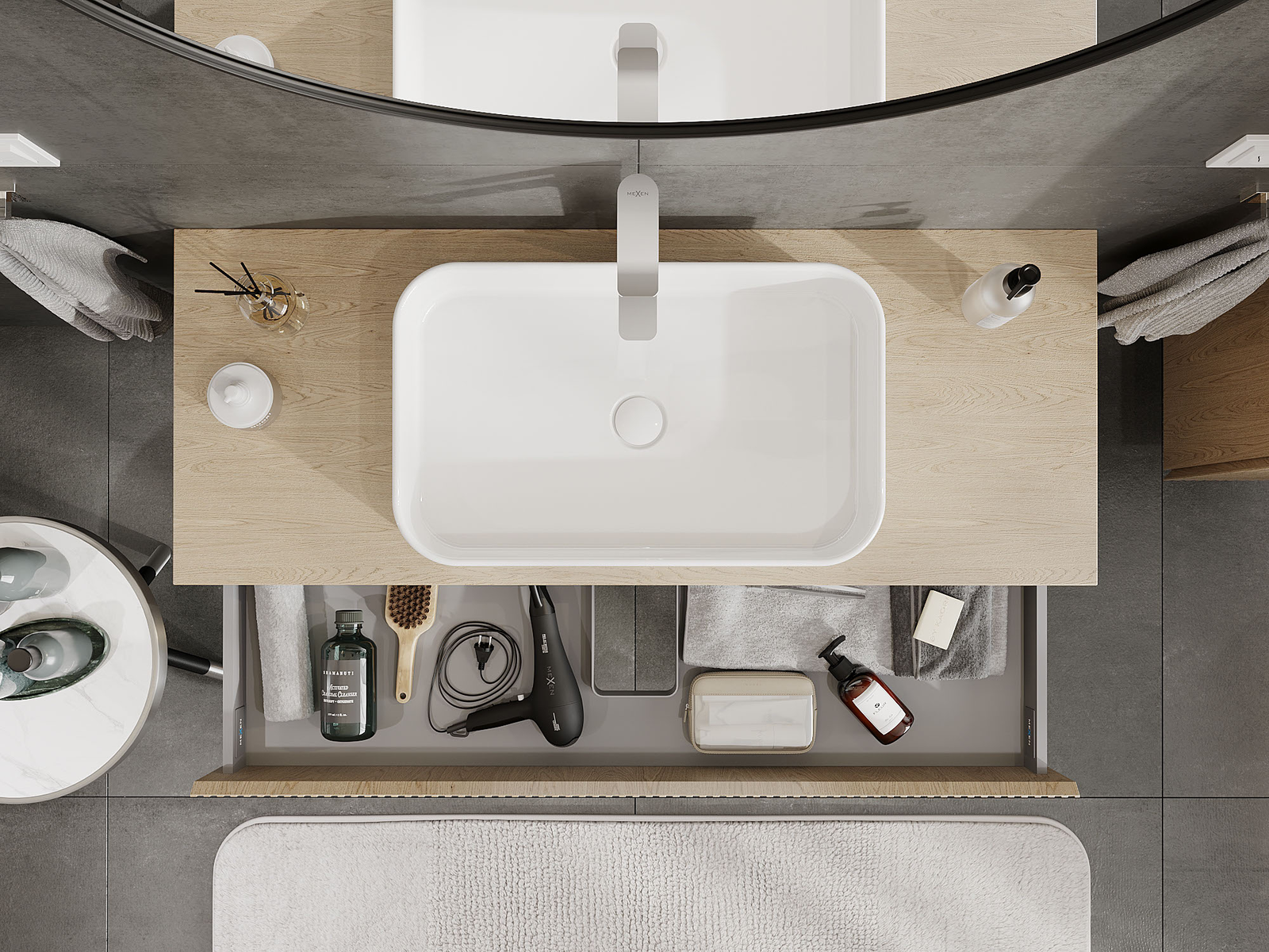 O recorte na gaveta é projetado de forma a acomodar o sifão, que é essencial em instalações de lavatórios. Graças a isso, o móvel pode ser montado de forma totalmente funcional, sem a necessidade de abdicar do espaço da gaveta em prol da instalação.