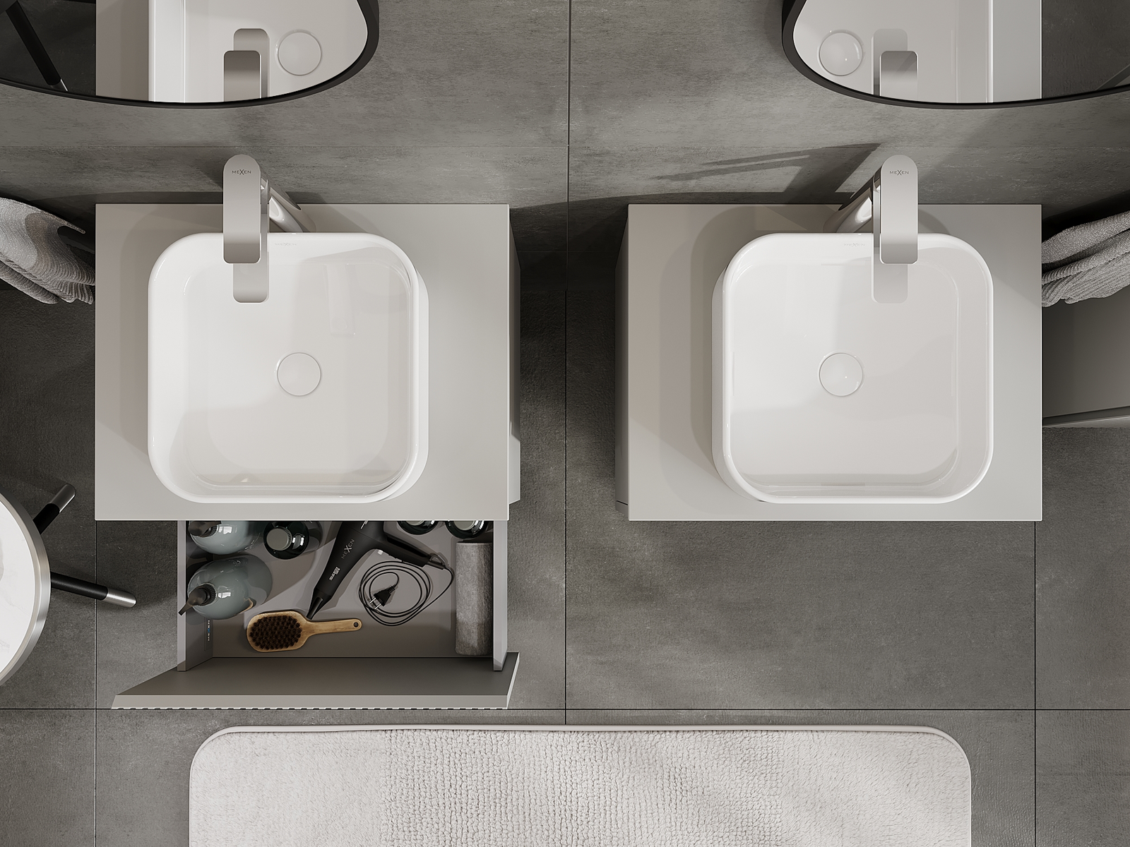 O recorte na gaveta é projetado de forma a acomodar o sifão, que é essencial em instalações de lavatórios. Graças a isso, o móvel pode ser montado de forma totalmente funcional, sem a necessidade de abdicar do espaço da gaveta em prol da instalação.