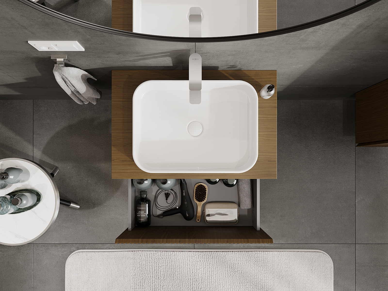 O recorte na gaveta é projetado de forma a acomodar o sifão, que é essencial em instalações de lavatórios. Graças a isso, o móvel pode ser montado de forma totalmente funcional, sem a necessidade de abdicar do espaço da gaveta em prol da instalação.